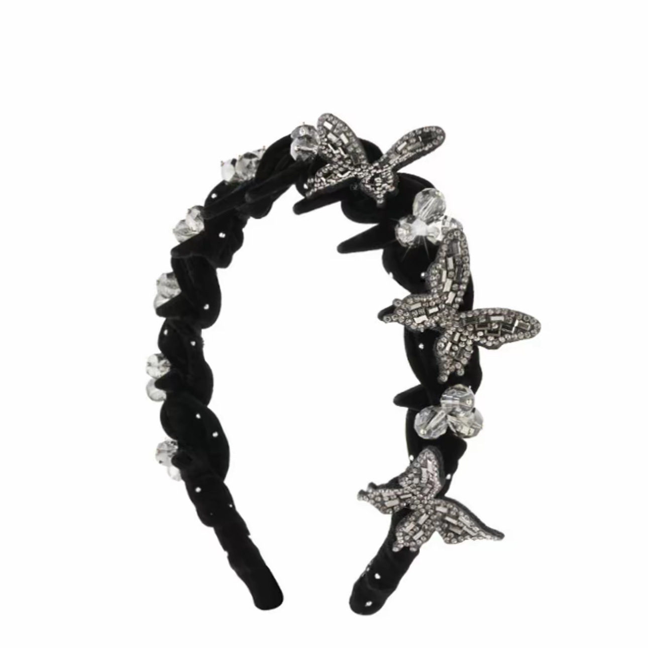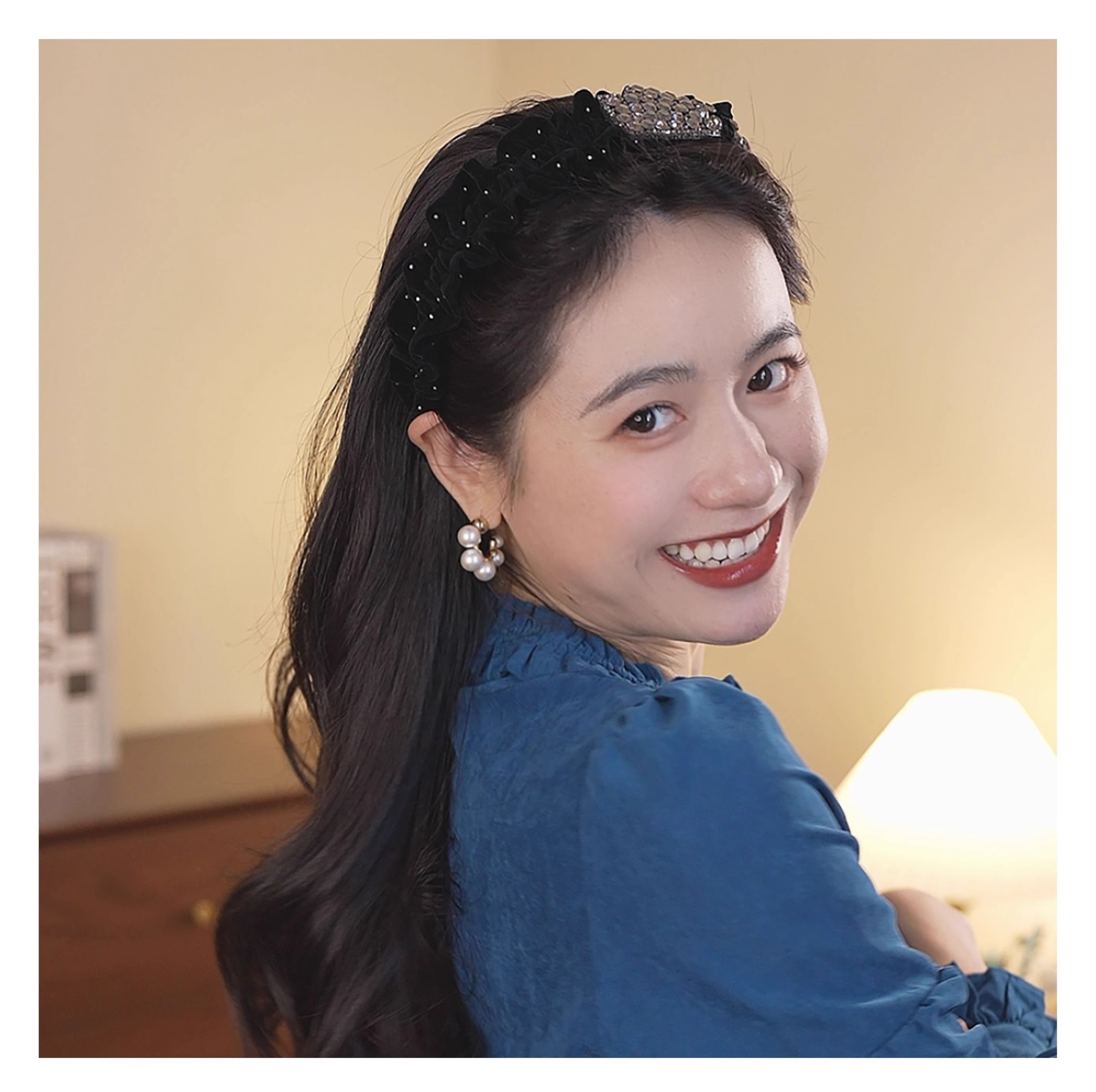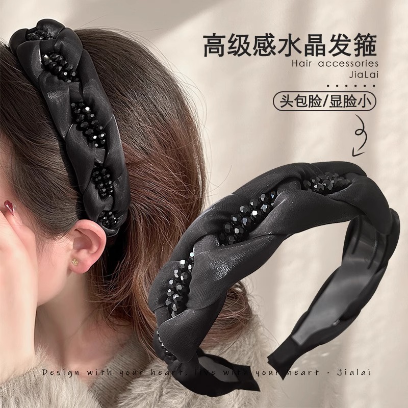 春夏のカチューシャの高い首のトップの女性の日常の外は新型の欧根の紗をつけて黒色の水晶の髪飾りの高級感を編みます。