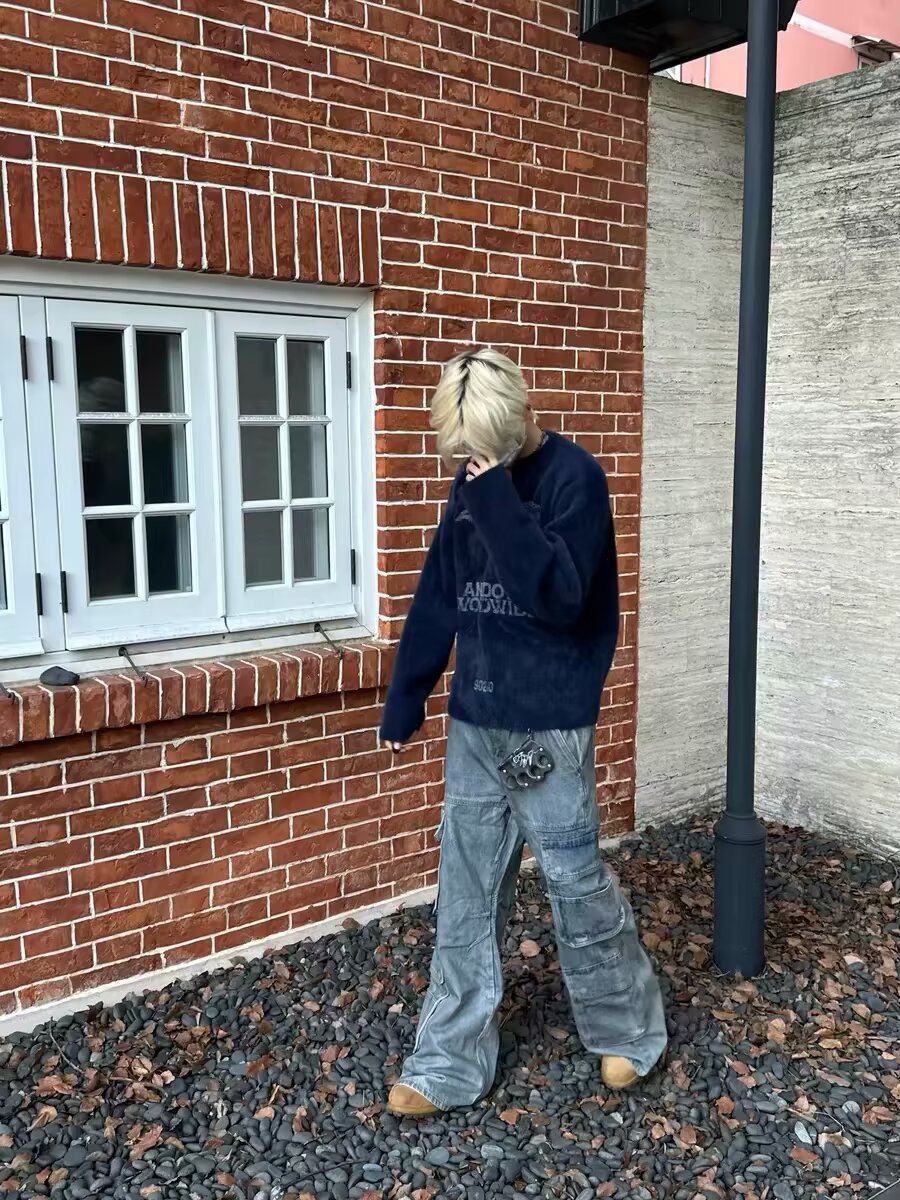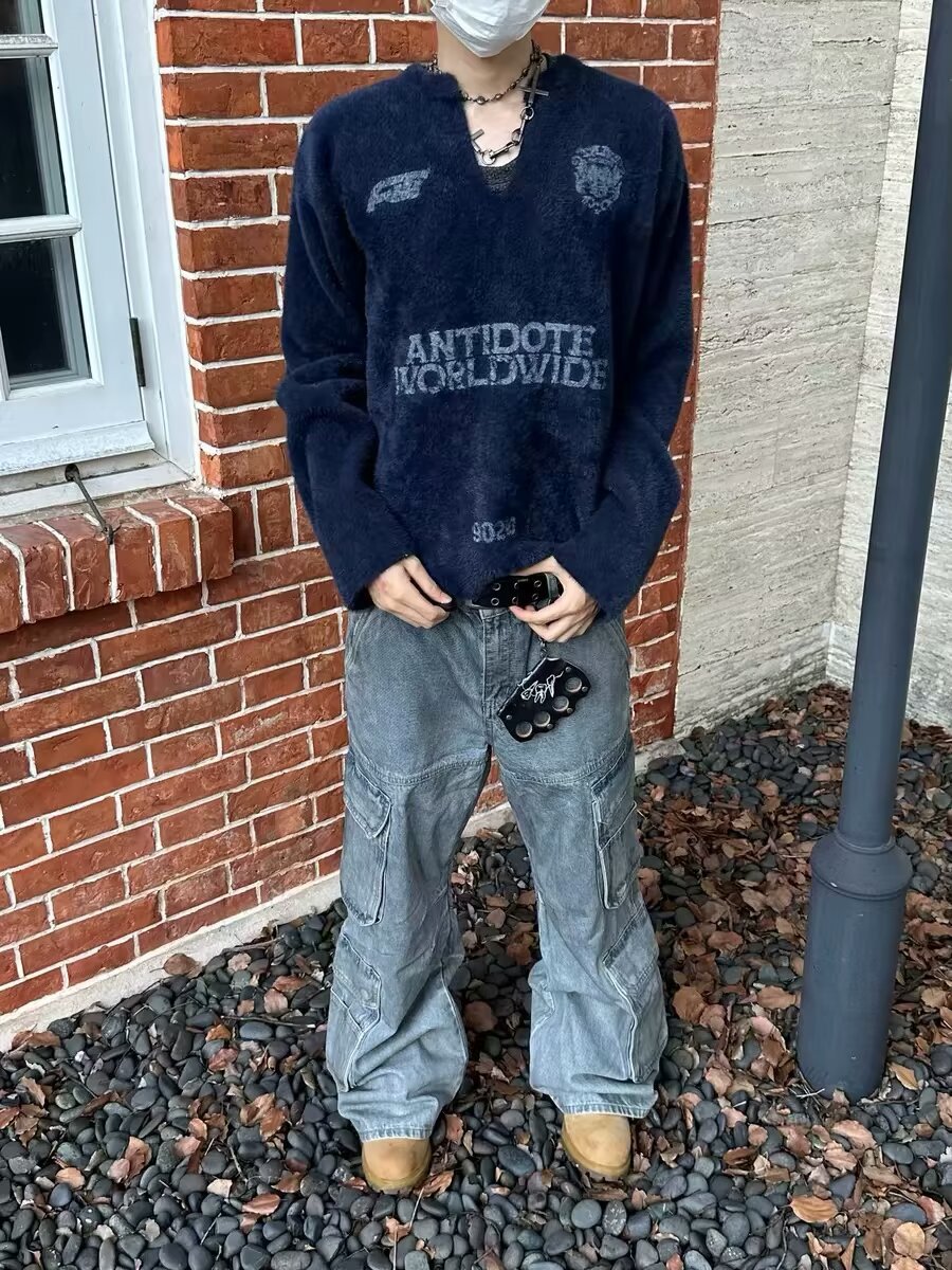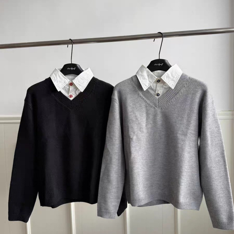 美式复古拼接假两件毛衣男女cleanfit韩系高智感宽松情侣针织衫潮