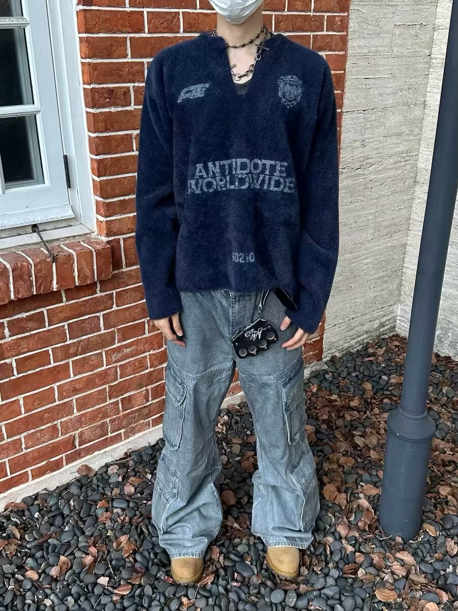 アメリカのミンクの毛のスポーツ風のセーターのアメリカの復古のバッジのプリントのvネックのボールの服のベルベットのニットのコートの潮