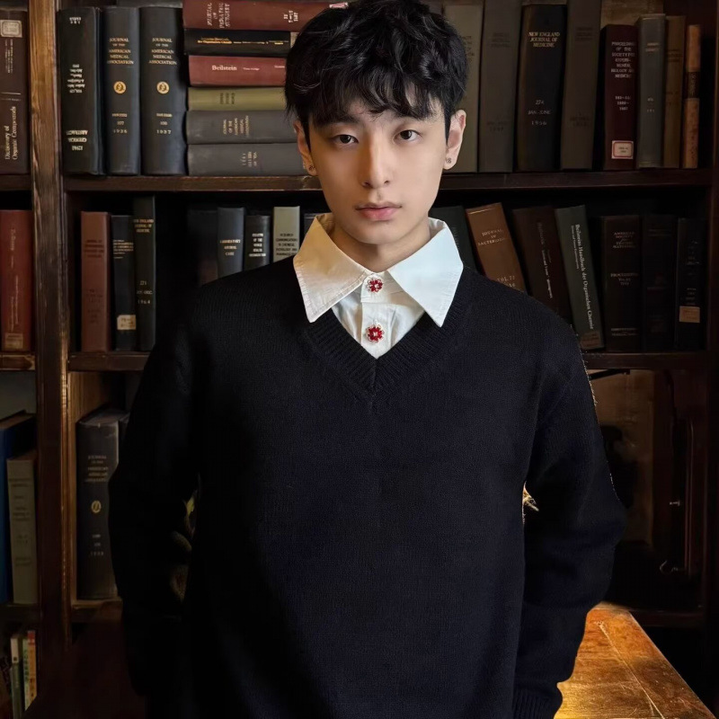 高智感穿搭假两件V领毛衣男款秋冬慵懒风美式高级感老钱风毛线衣