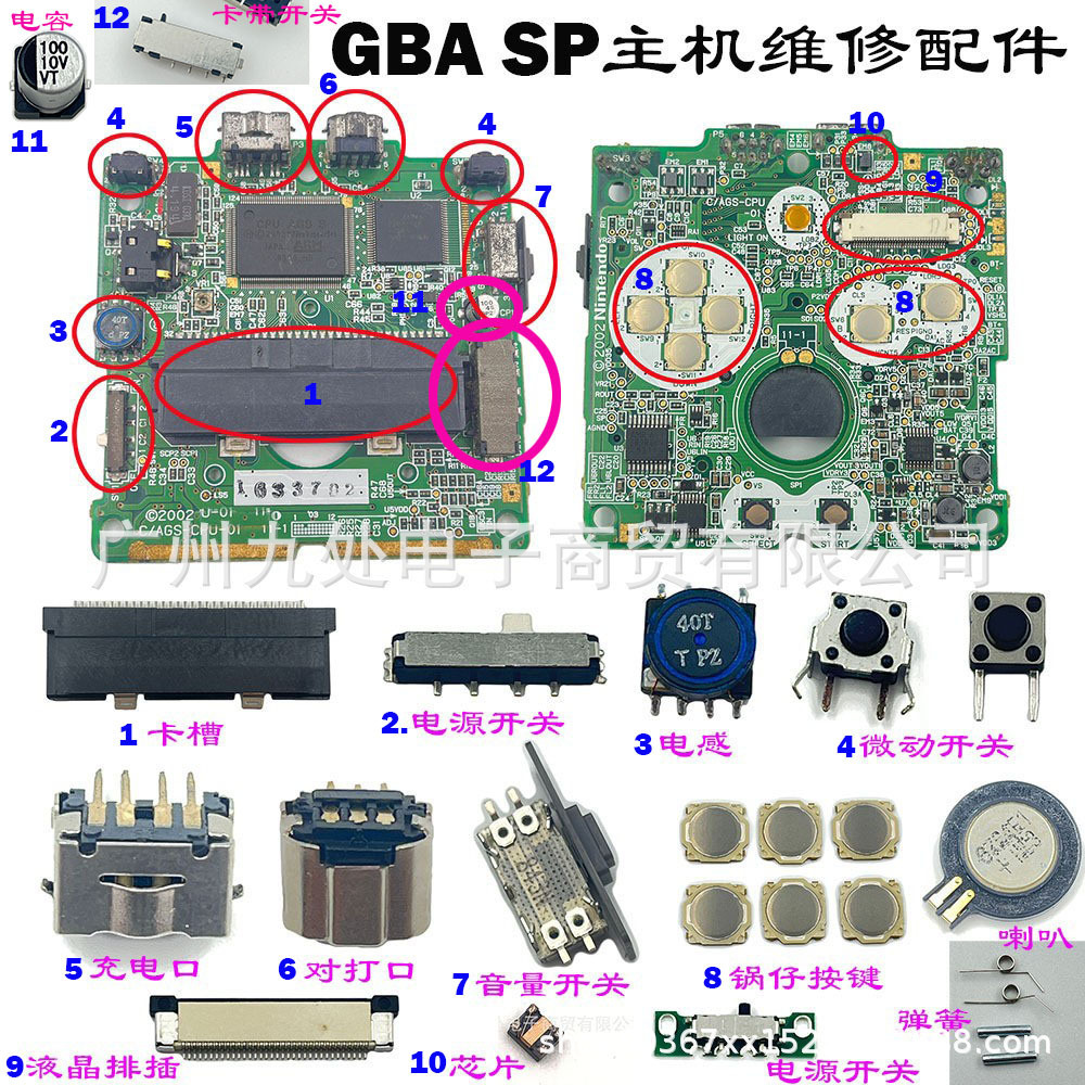 适用GBA SP游戏机 电源开关 音量开关 卡槽 充电口 液晶排插 配件