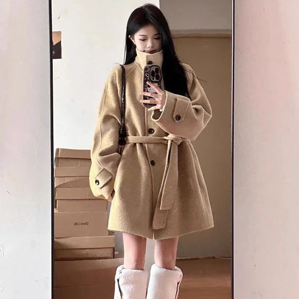 立襟高級感カーキ色のラシャコート女性2025春秋冬の小柄な韓系の怠惰なコートです。