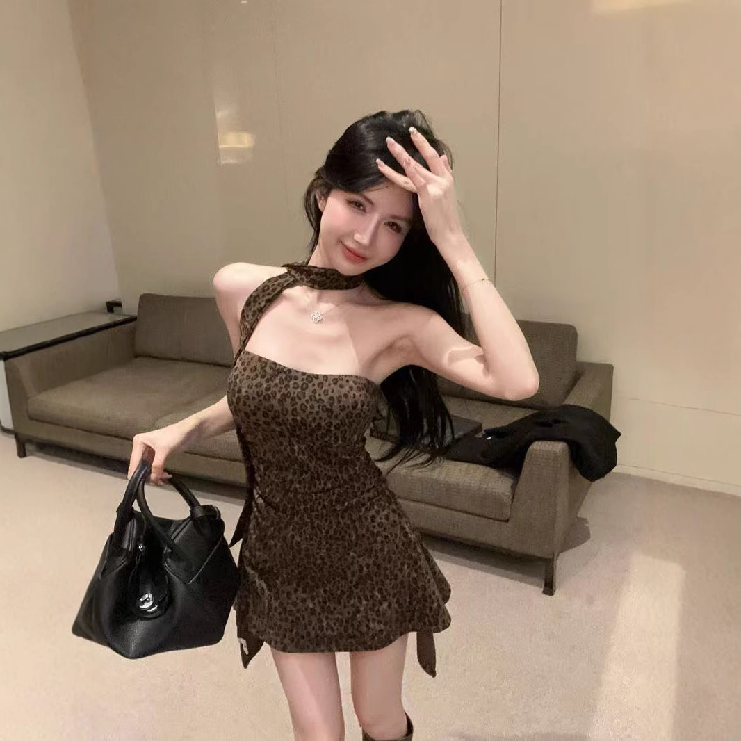 港の味のギャルの風は首の豹の紋様の襟のワンピースを掛けます不規則に身を修めます。