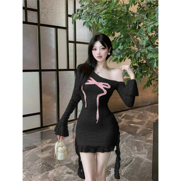 純粋な欲風の蝶結びのレースの肩の長袖のワンピースの女性の秋冬の新型の修身はやせている包みのお尻の短いスカートを現します。