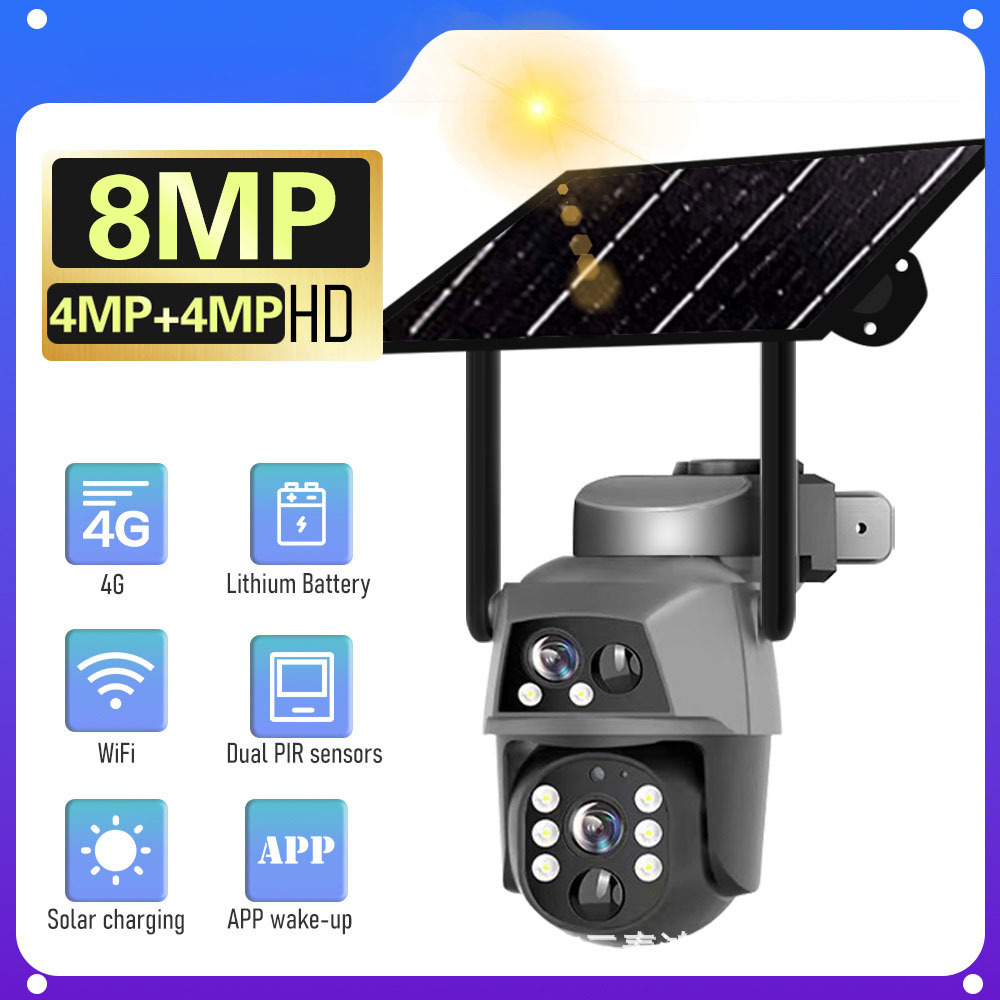 8MP4K太阳能摄像机4G户外双镜头网络摄像机PIR夜视摄像CCTV监控