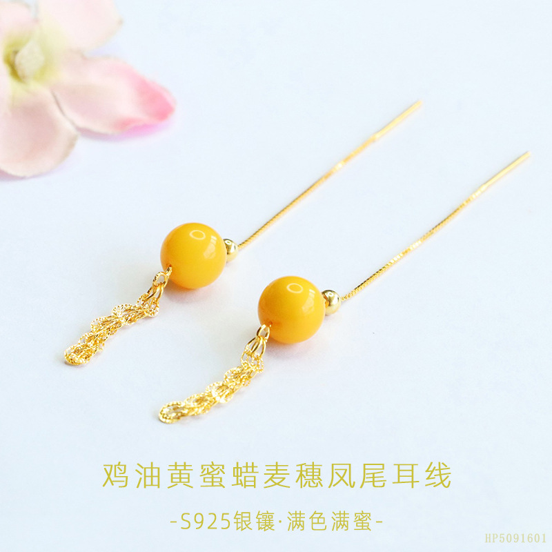 眷钰 天然鸡油黄蜜蜡耳饰琥珀S925银凤尾耳线直播批发S5091601