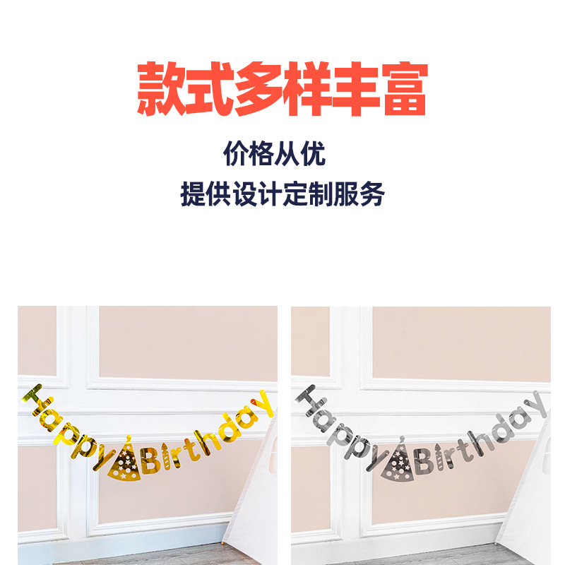 光沢のある金と銀のカラーの帽子の誕生日のアルファベットの旗の誕生日のパーティーの装飾の横断幕の道具のシーンの配置品
