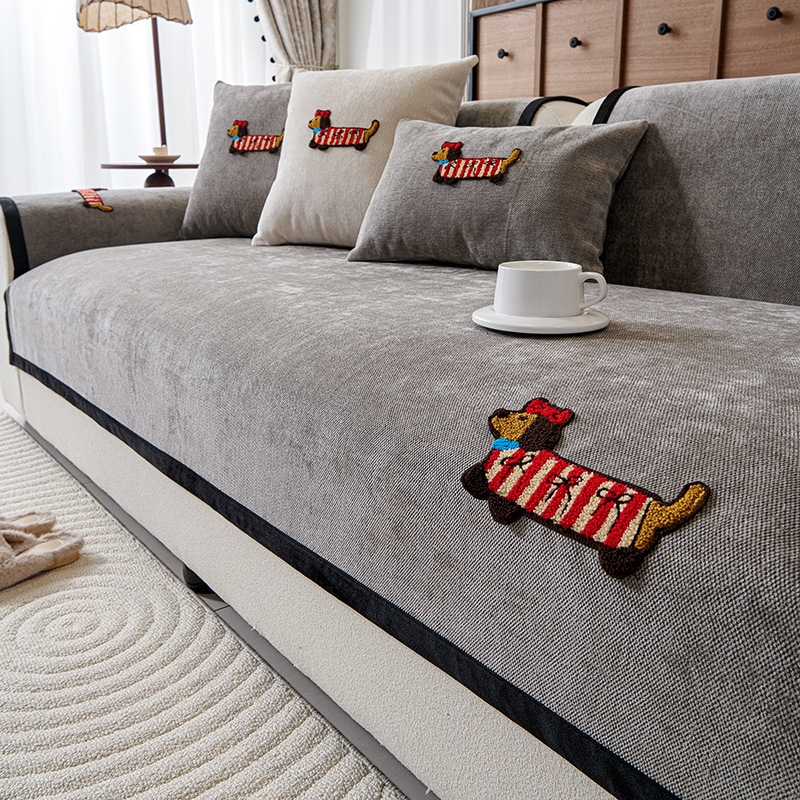 2025新型四季通用ソーセージ犬刺繍シェニール滑り止め耐磨耗ソファーマットソファーカバー布