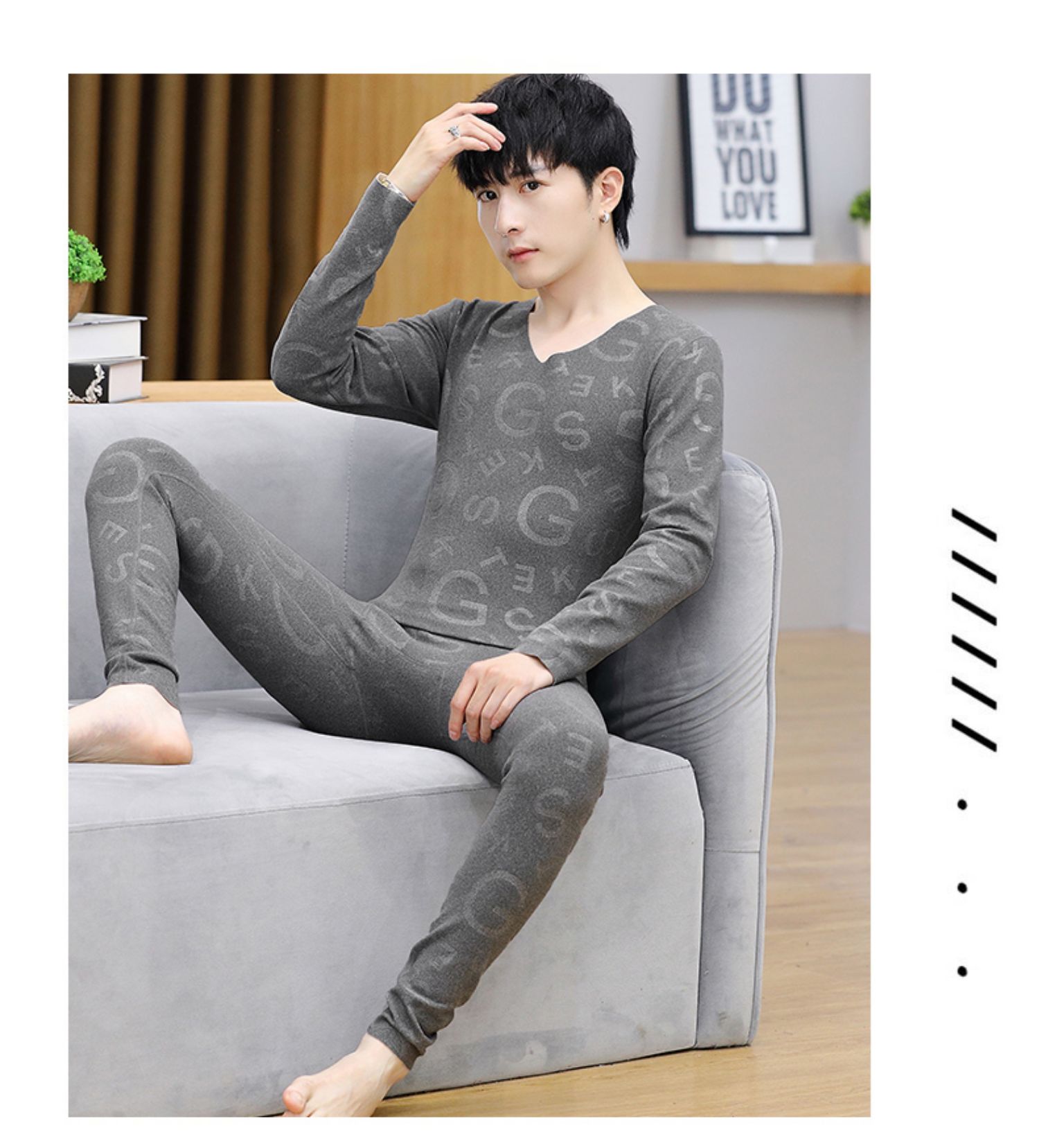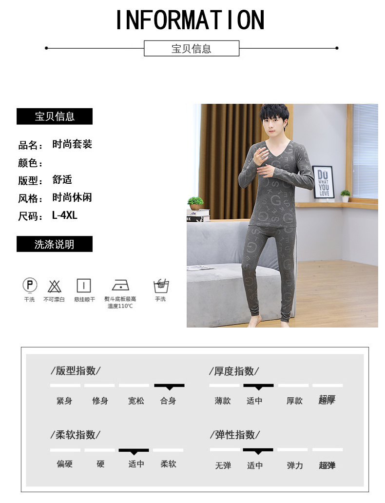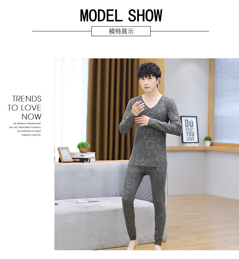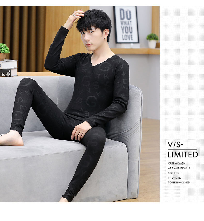 2025冬季新款保暖内衣男士v领秋衣秋裤套装印花新款打底穿卫生裤