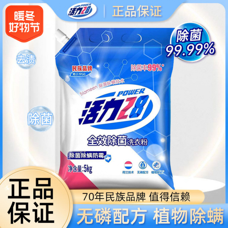 活力28全效洗衣粉5kg大袋装带嘴袋装抑螨防霉去渍深层去污洁