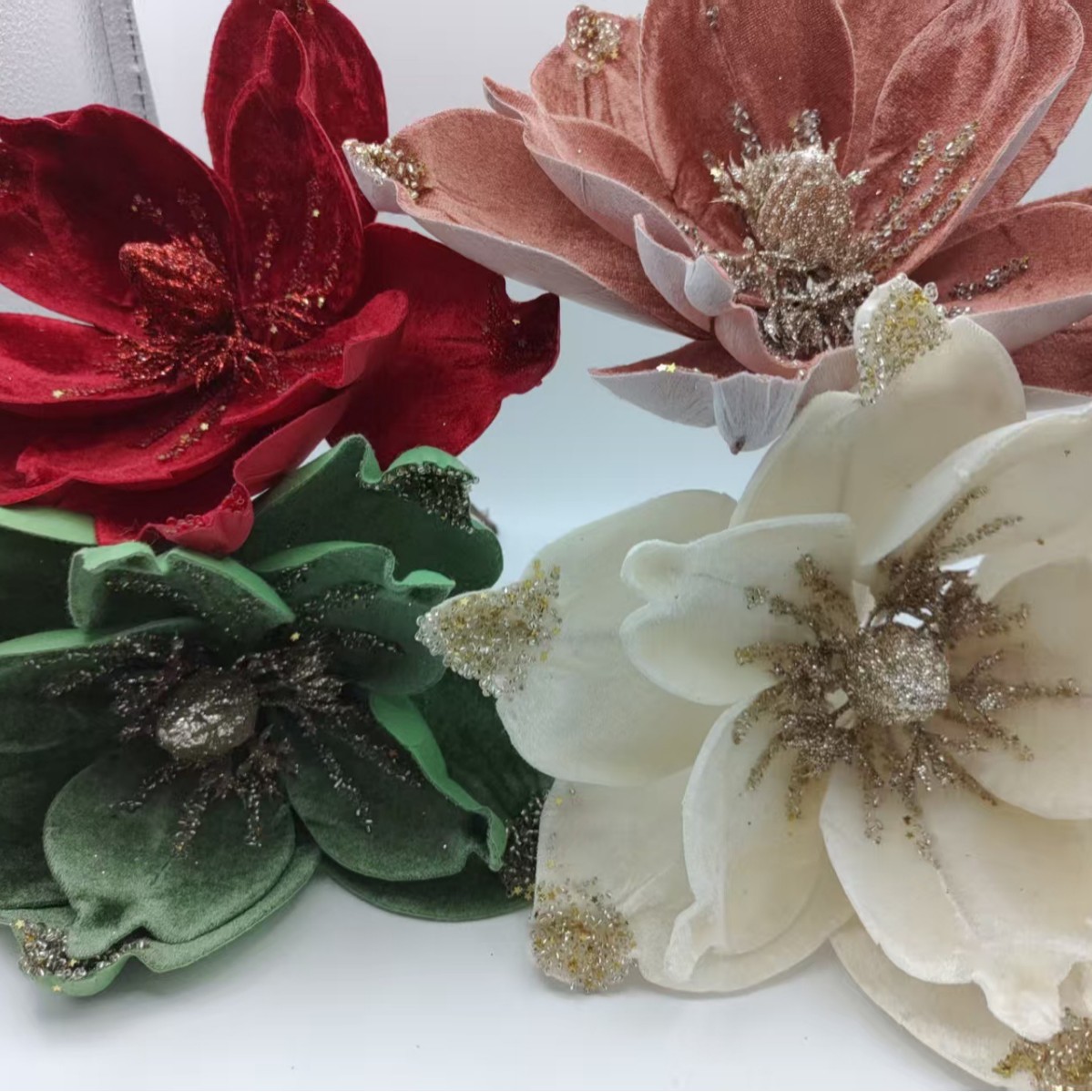 2025新款圣诞金色仿真圣诞花玉兰花布艺圣诞节装饰品仿真花家用