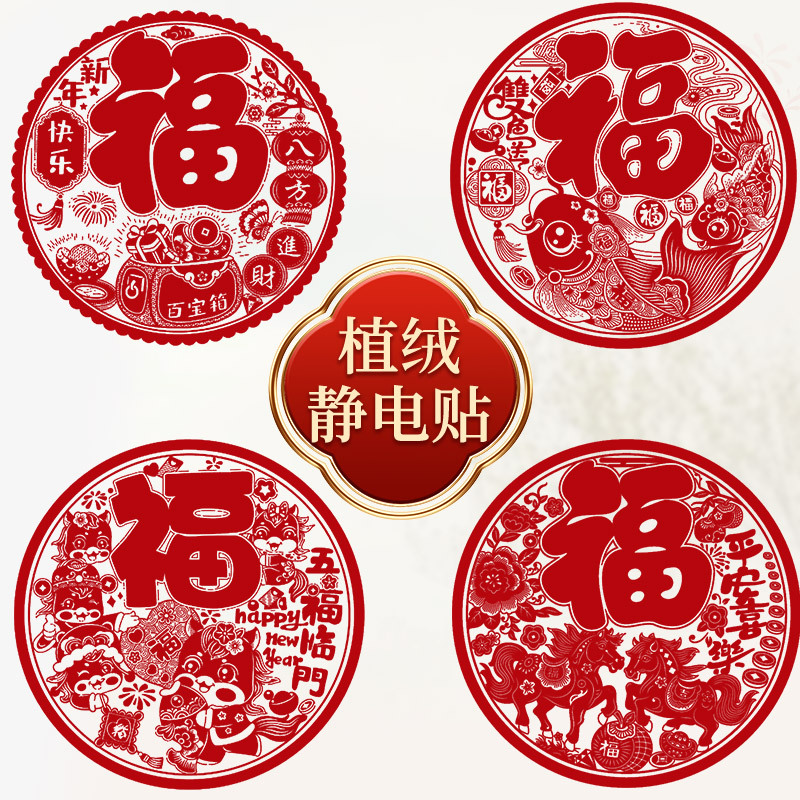 新款马年福字剪纸窗花贴玻璃贴新年装饰植绒静电贴墙贴春节布置品