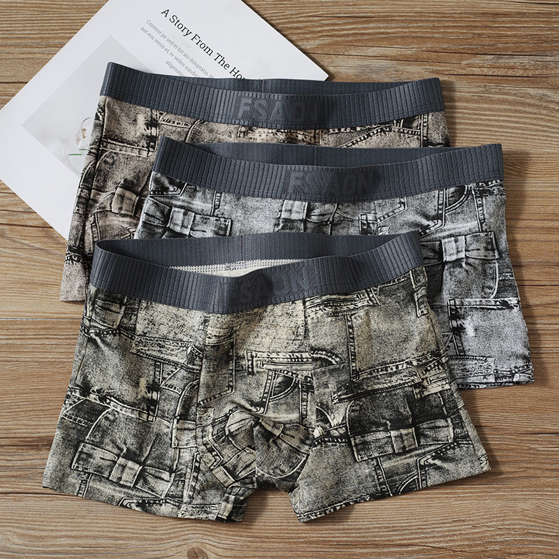 新款牛仔印花男士内裤纯棉运动舒适透气平角青年潮流个性四角内裤