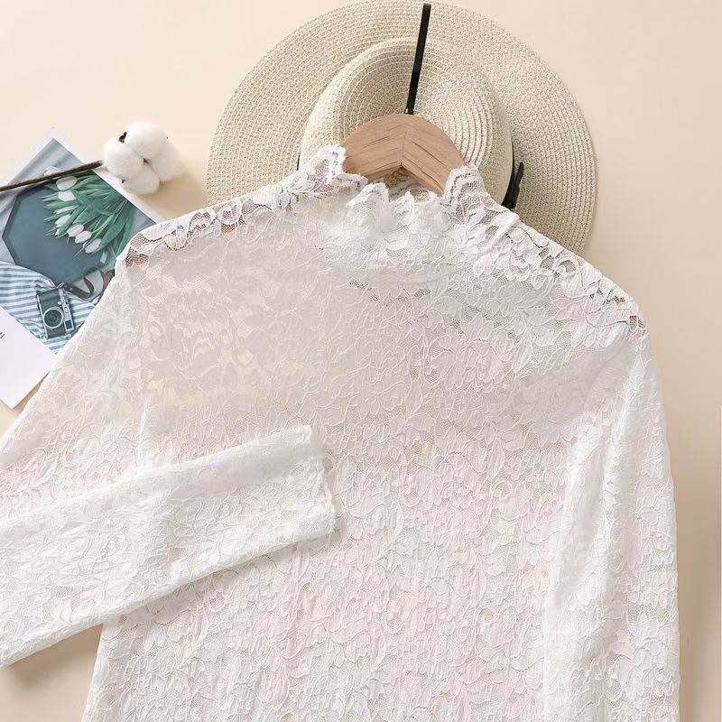 2024ベルベット半高襟修身レースシャツ長袖tシャツ女性韓国版気質ガードル