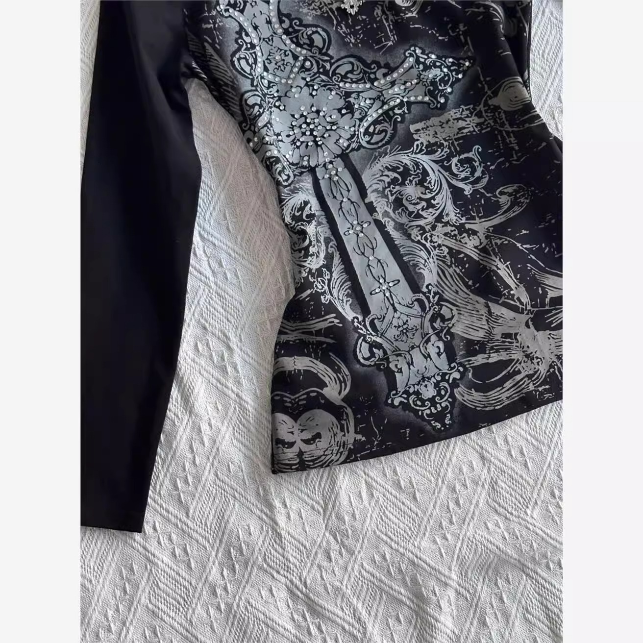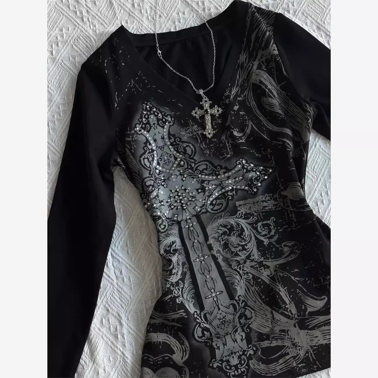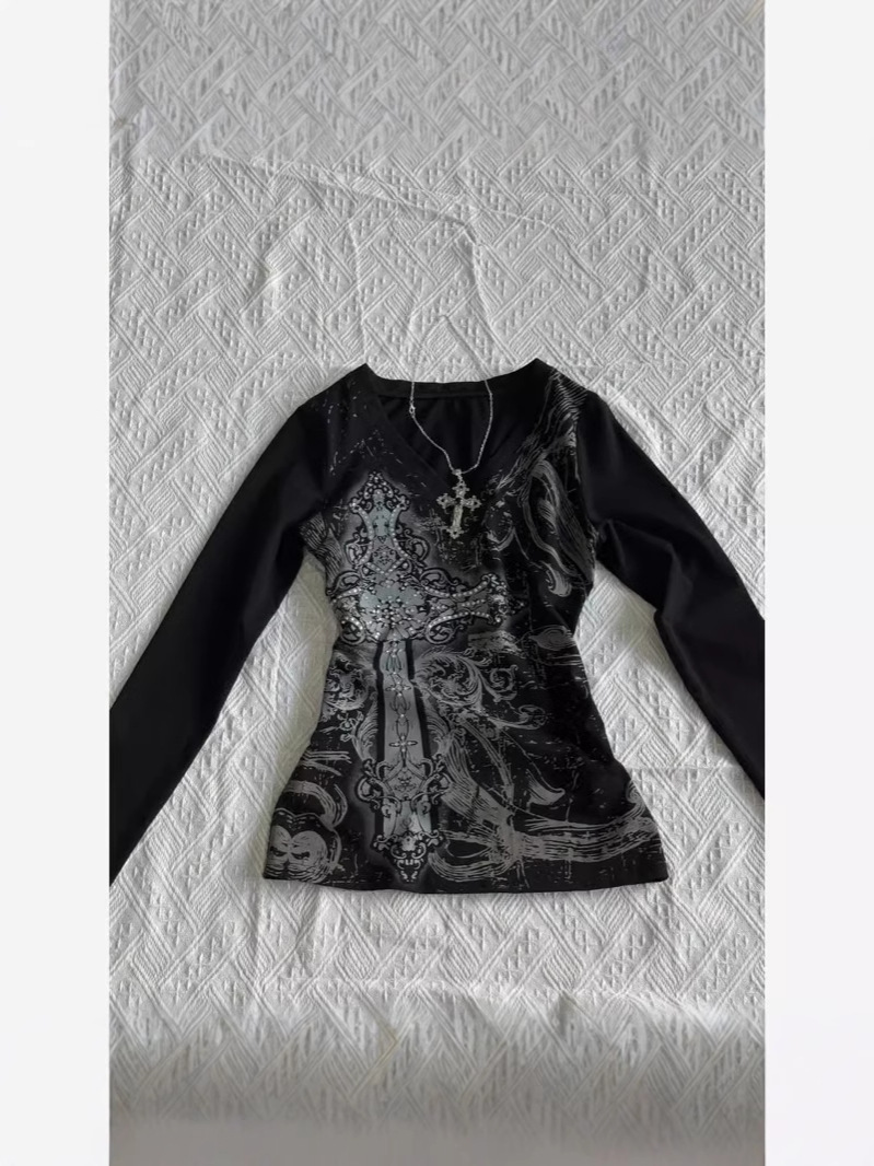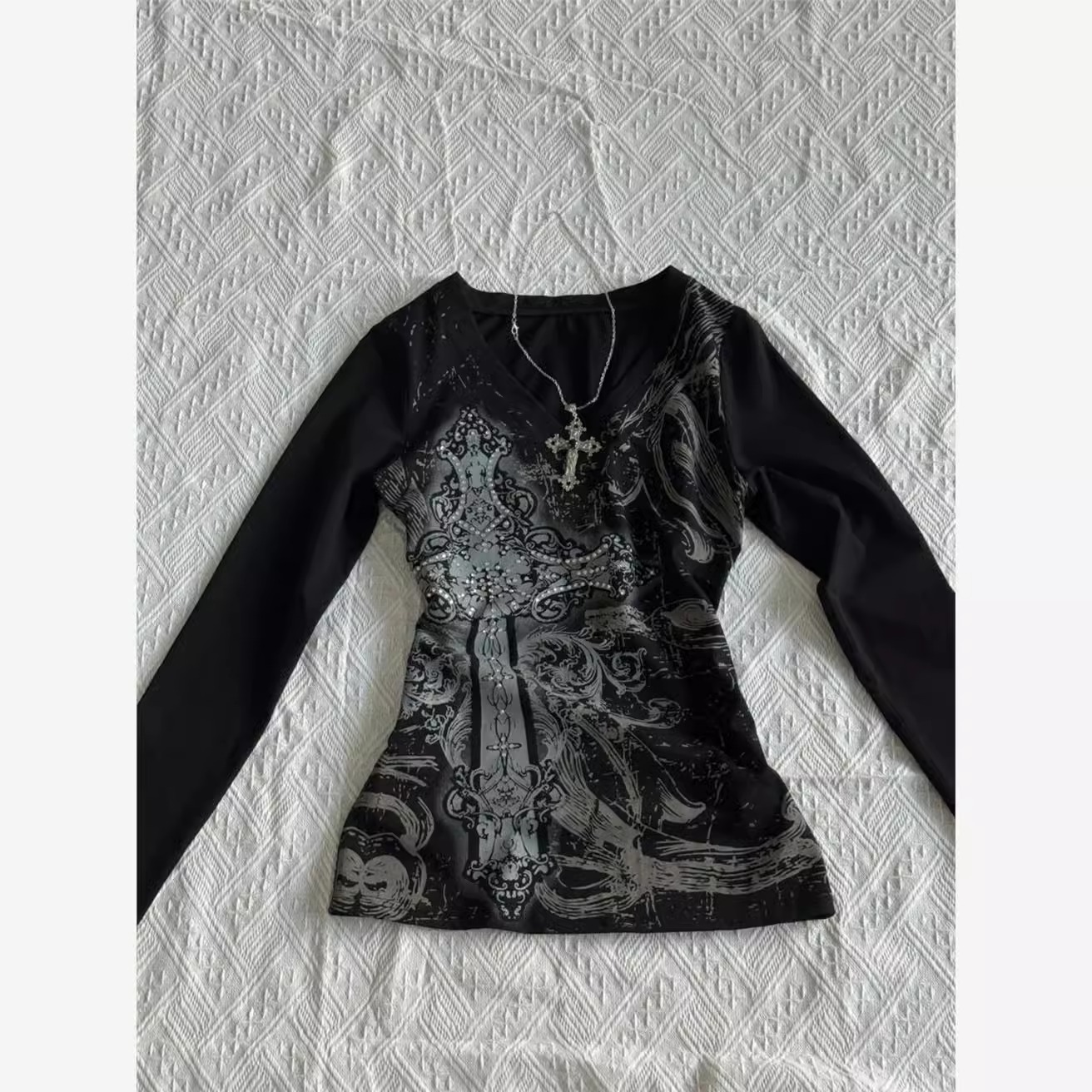 アメリカンアビー文化デザイン感黒プリントtシャツ女性秋y 2k純欲vネック長袖tシャツ上着
