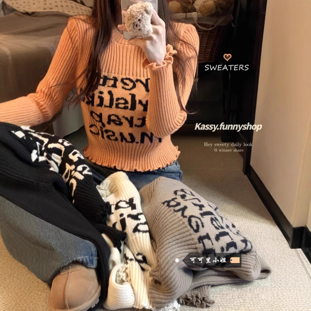 木の耳元のアルファベットの長袖のニットの女性の秋の新型のデザイン感は身を修めるのが見えます。