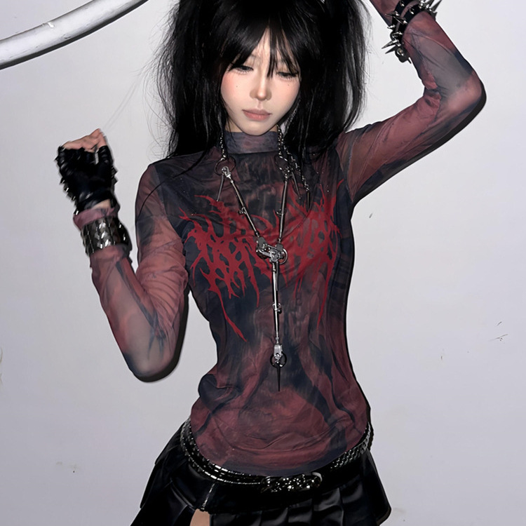 アメリカンy 2k亜文化上着女性レトロ千年ギャル風パンクロックはプリントネットの長袖tシャツを着ています。