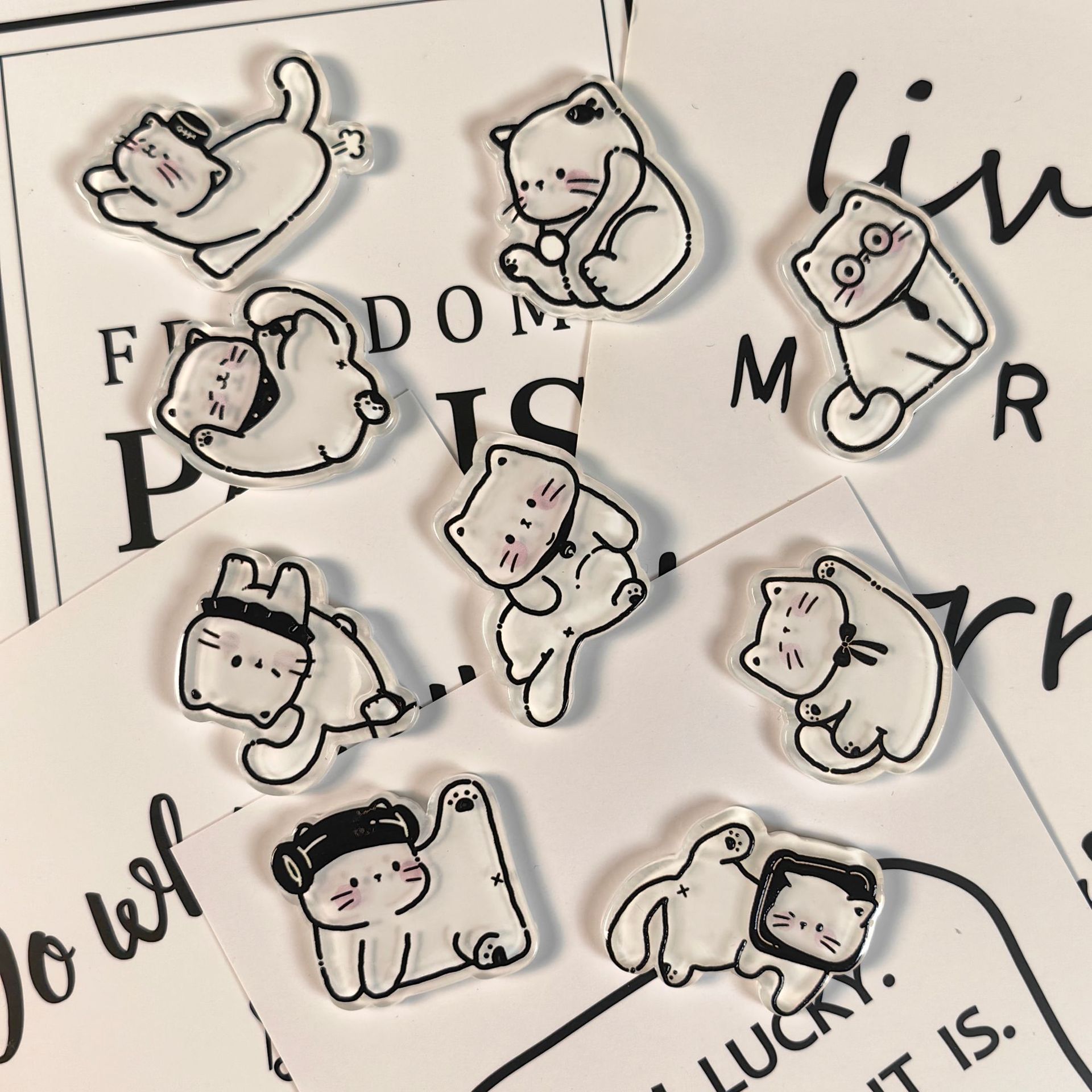 かわいい線の落書きの猫のアクリルの小さいサイズの髪はブローチの冷蔵庫を挟みます。