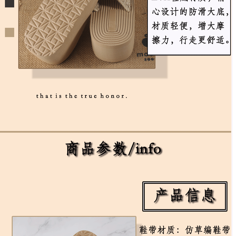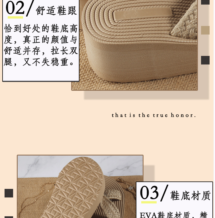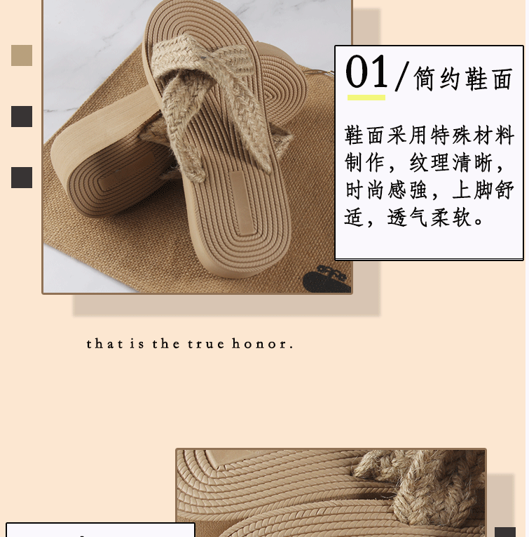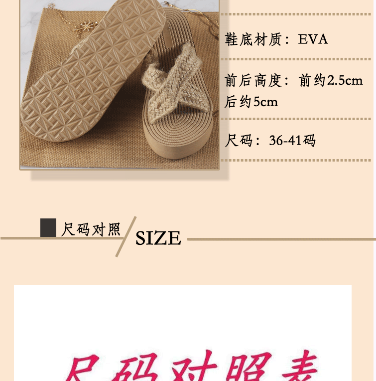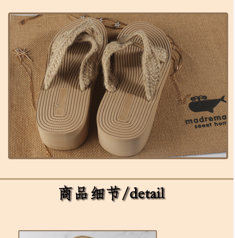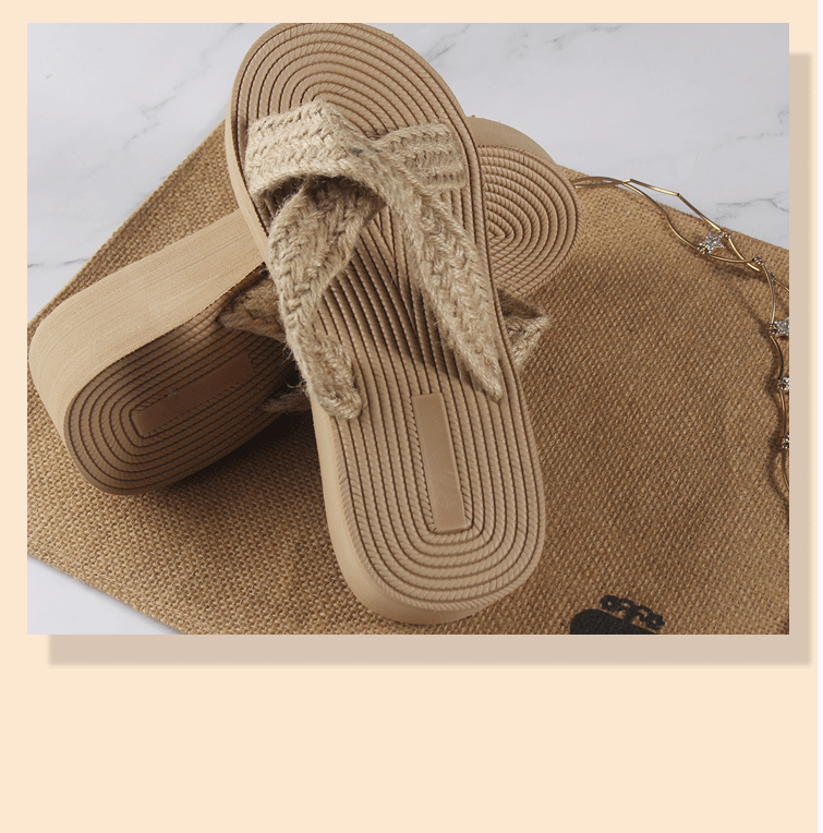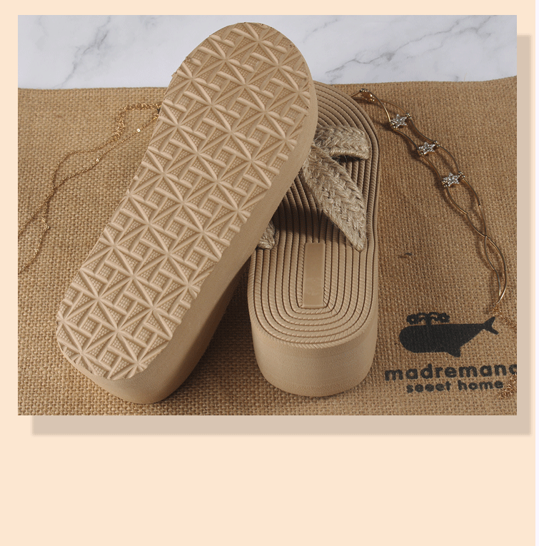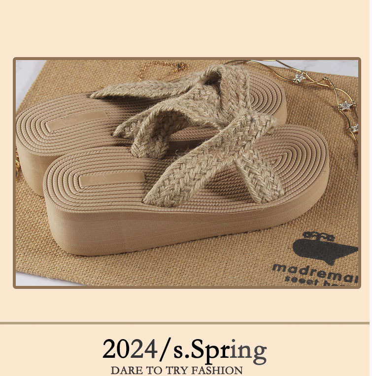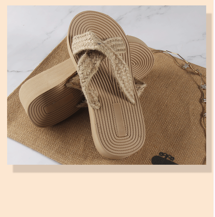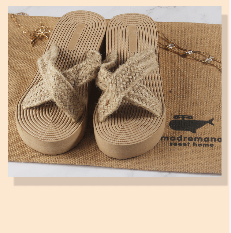 春夏の新型の1字のスリッパの女性の厚い底の外は足の不自由と女性のスリッパのファッションの民族の風を着て麻縄の女性のスリッパをまねます。