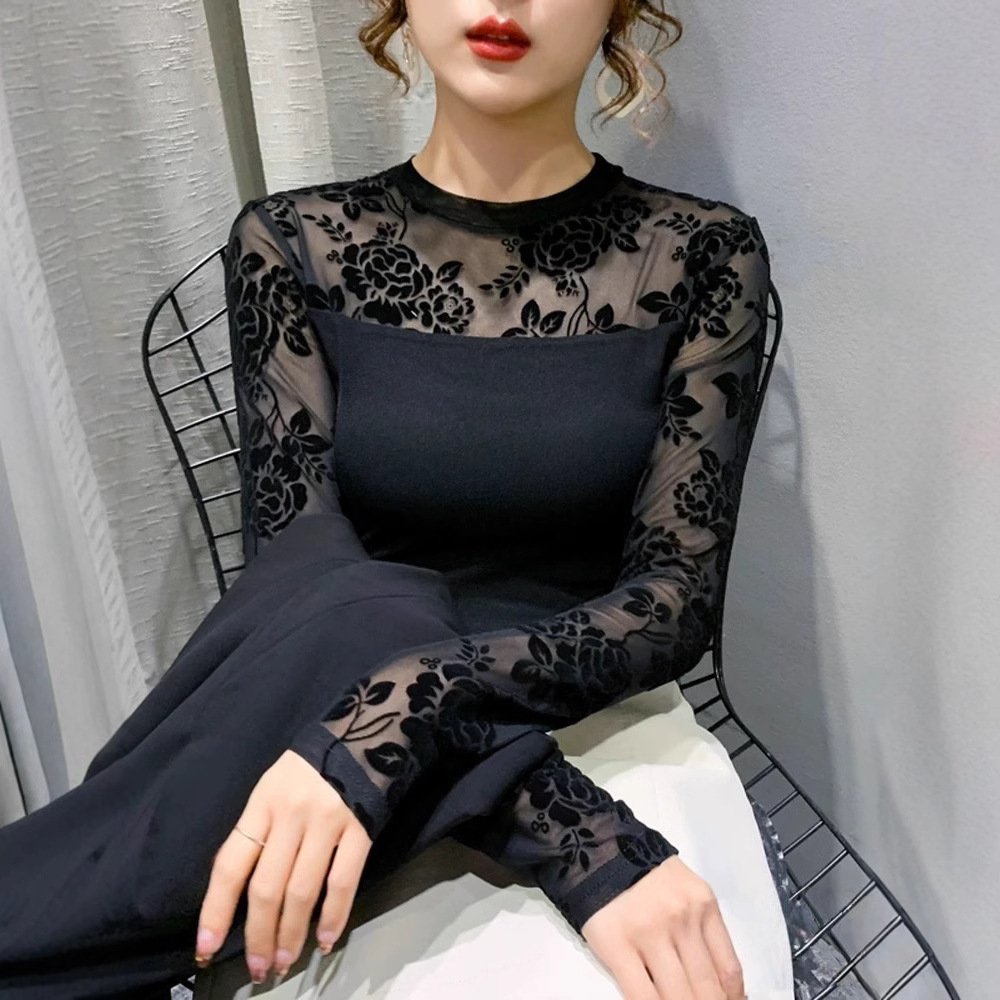 ラウンドネックメッシュスプライシング日焼け止めボトリングシャツ長袖2025夏の新作レーススリムTシャツセクシーな中空
