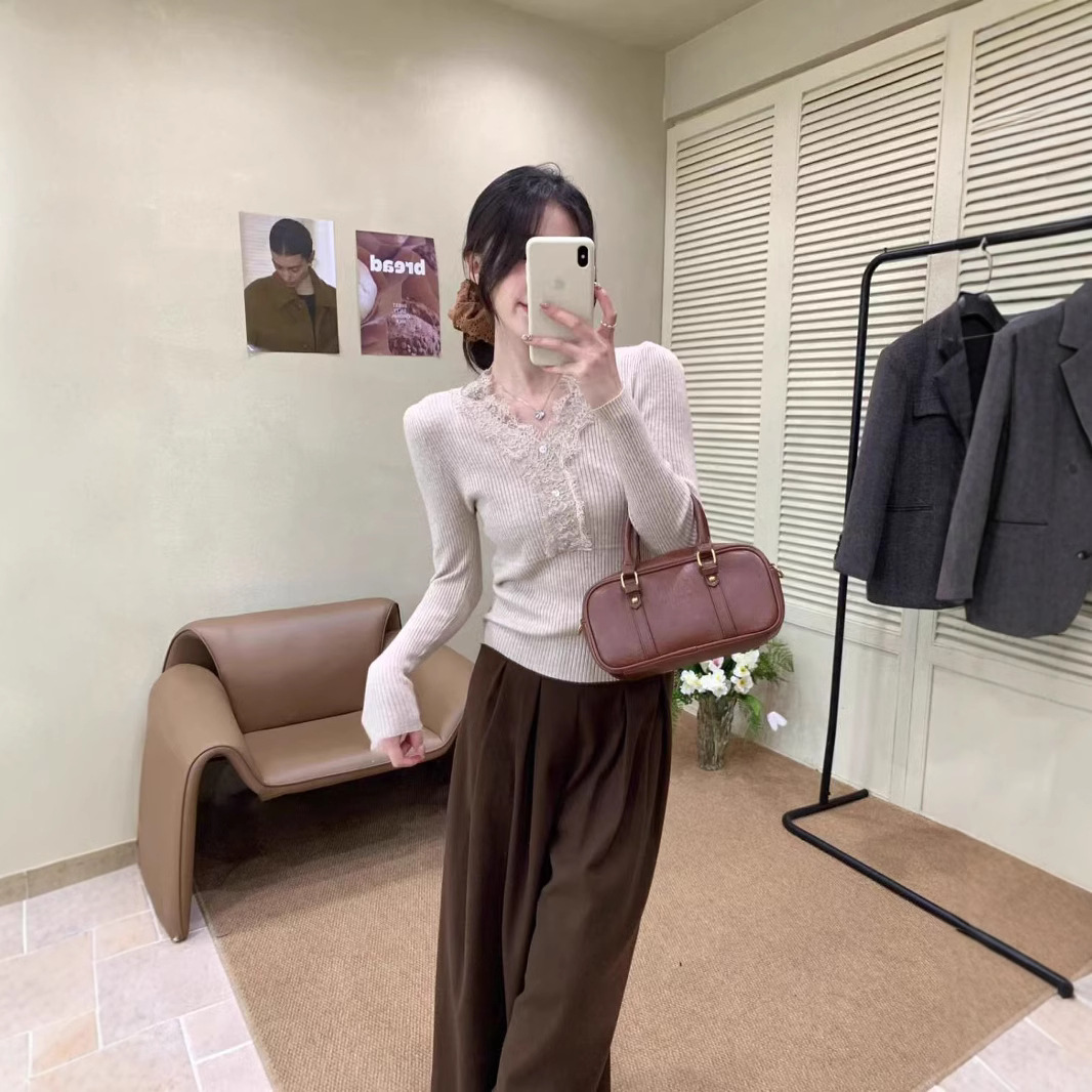 2024秋冬の新型レディーレースの縁にvネックの長袖のニットの女性のセーターの洋風の底のシャツの上着をつなぎ合わせます。