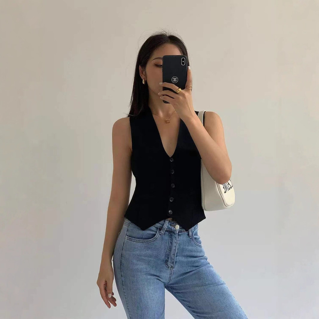 V ネック黒スーツベスト女性の 2025 春夏レトロレイヤードノースリーブチョッキウエストカーディガントップ