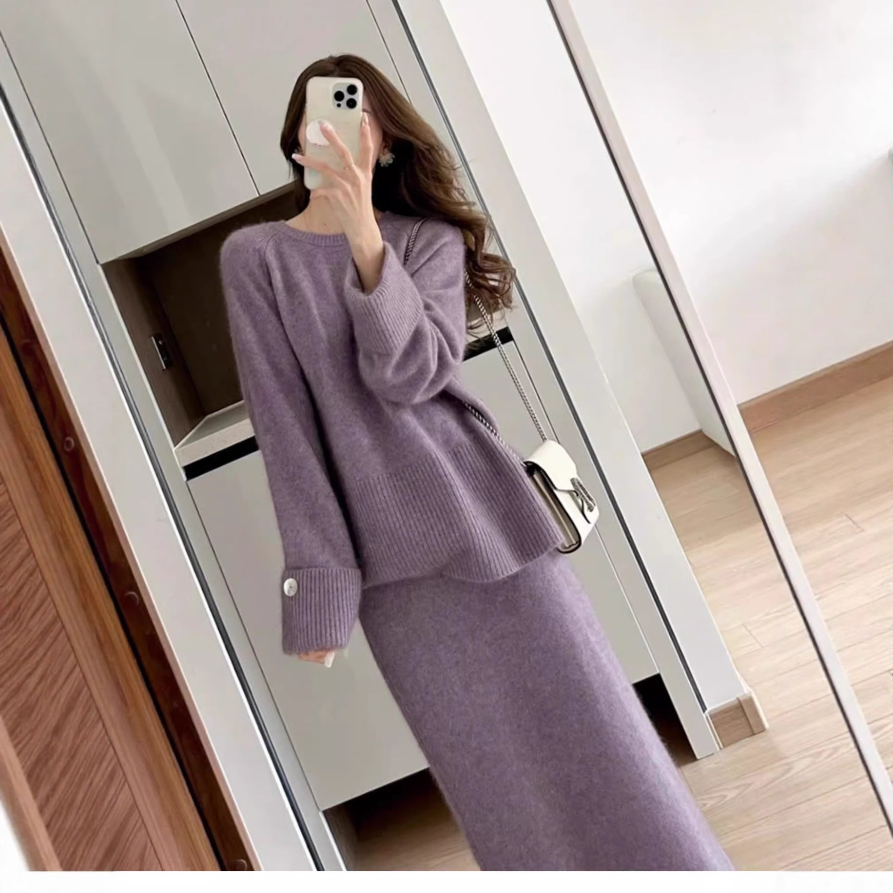 搭配香风紫色针织法式裙装时尚感100%纯羊毛上衣毛衣半身裙两件套