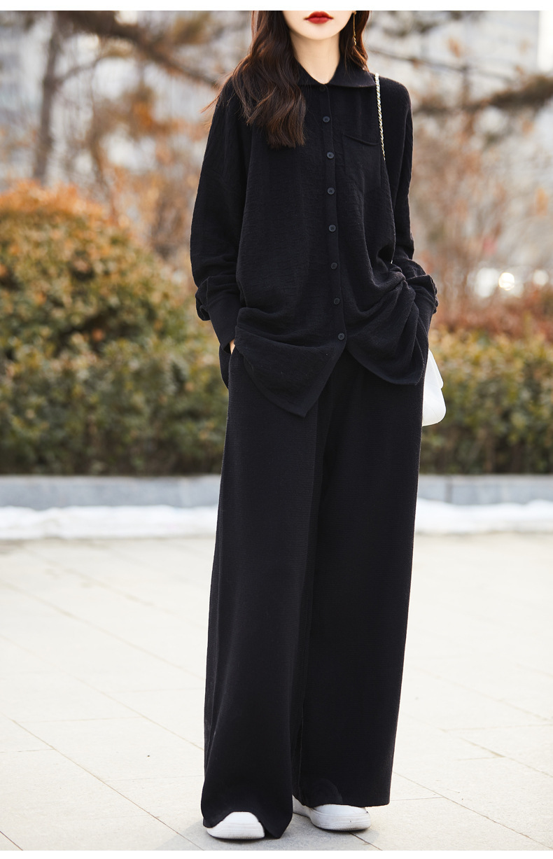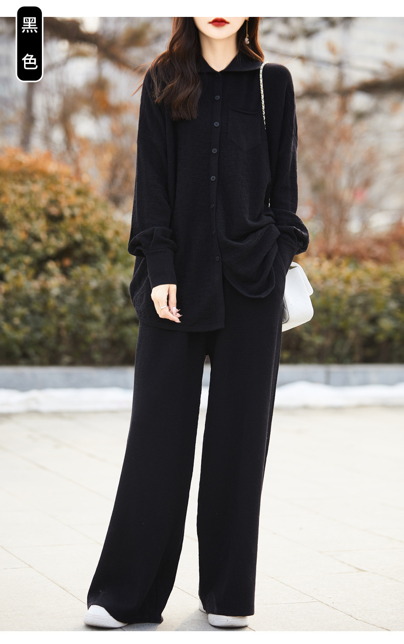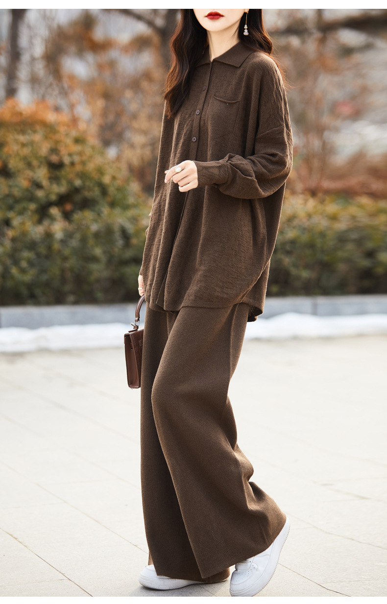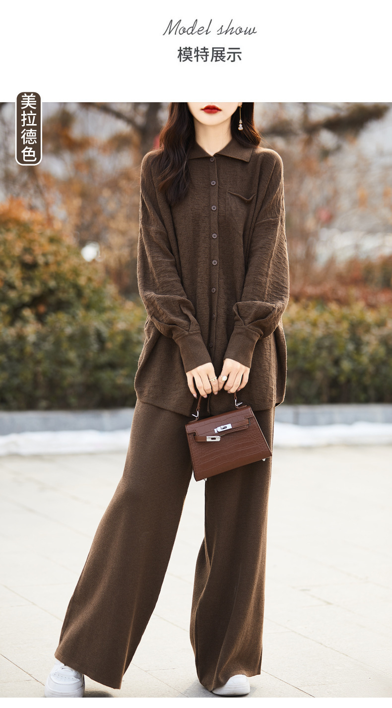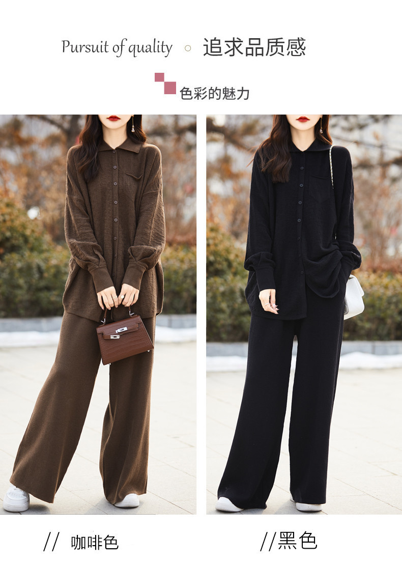 2025年秋冬新作 純毛ラウンドネックゆったりニットセーター長袖無地ハイウエストワイドパンツツーピースセット