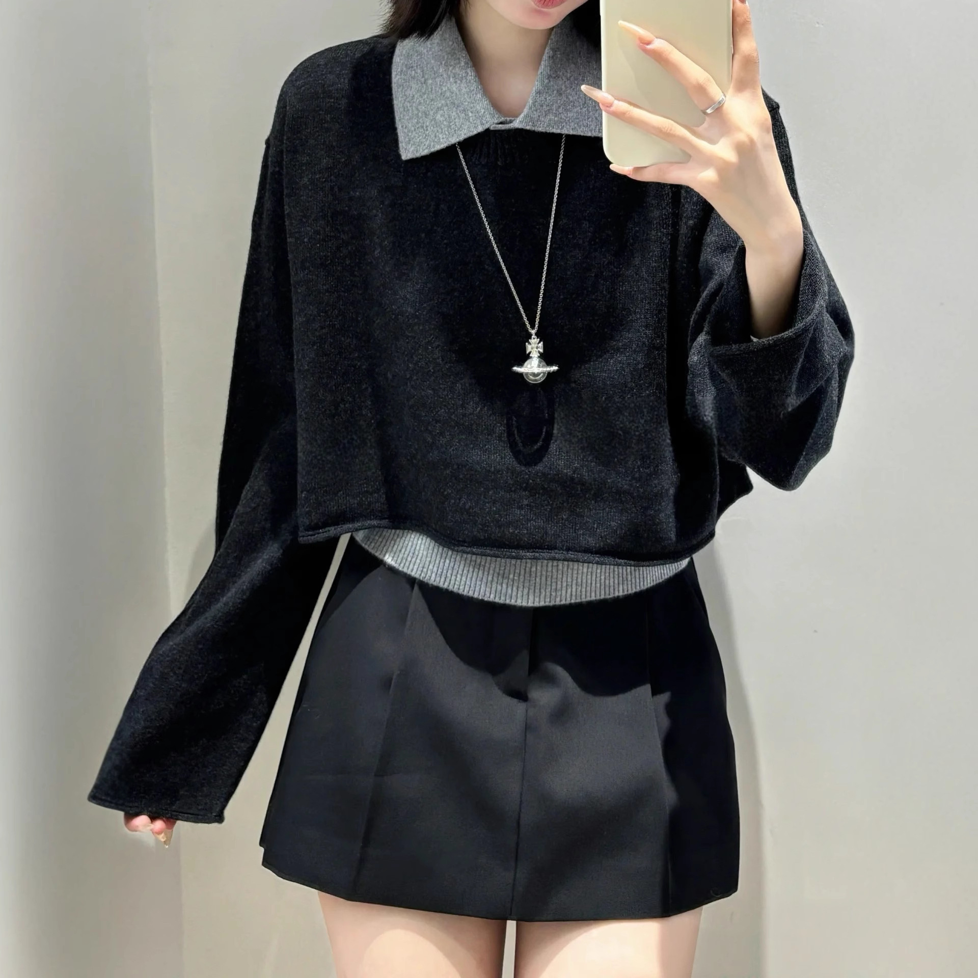 巨好看的秋冬一整套韩系慵懒风时尚polo领针织背心叠穿毛衣两件套