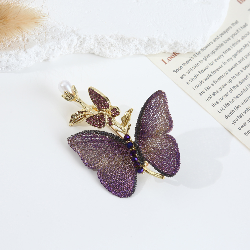 国潮国風軽豪華刺繍布芸蝶ブローチ紫青二色昆虫ピン高模造淡水真珠蝶