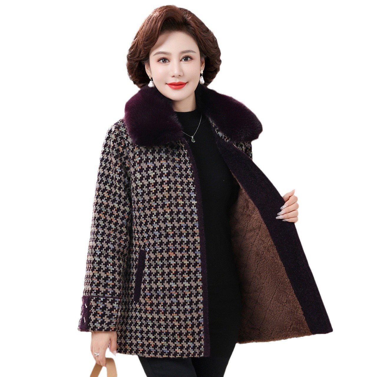 お母さんの冬服にベルベットをつけて、ミンクのベルベットのコートの中で高齢者の女装の洋気格子の保温毛を厚くしていますねコートが湿っています