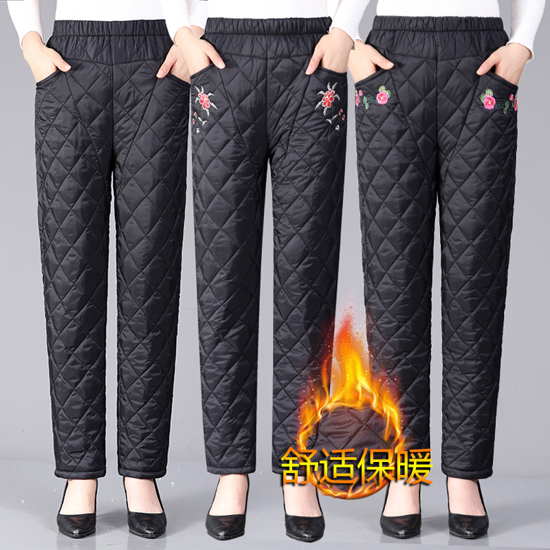 お母さんの冬用長ズボン、ダウンコットン、格子柄、ゴムウエスト、ハイウエスト、カジュアルレディースパンツ、アウター、中高年向け、保温性