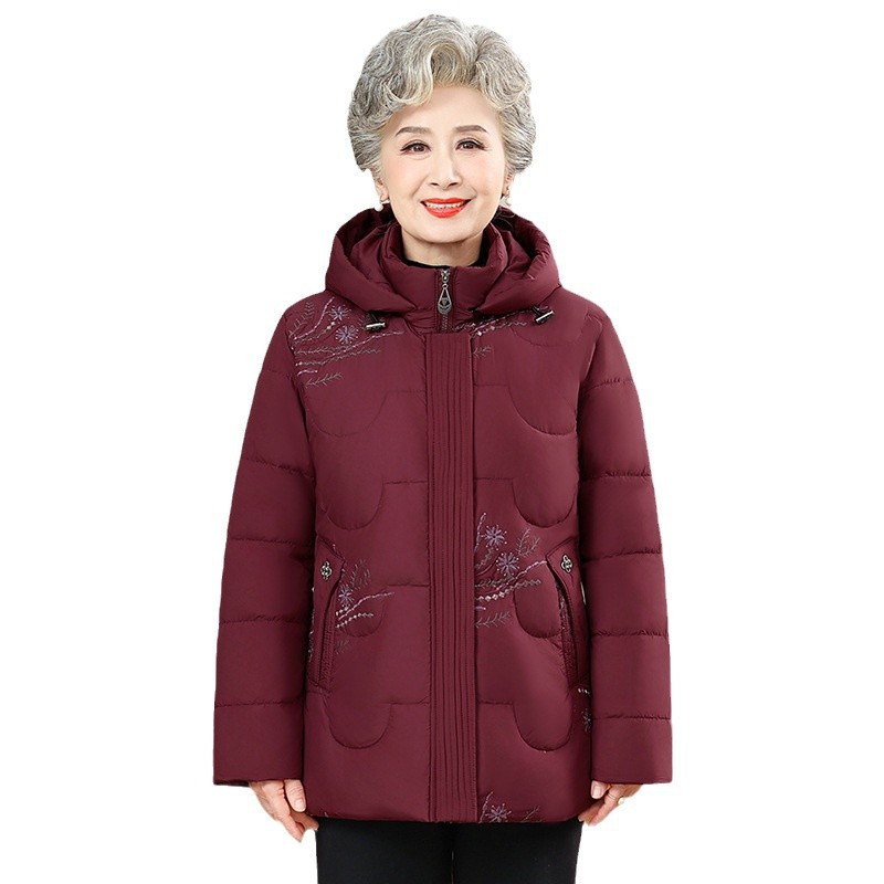 おばあさんは冬服のダウンジャケットと帽子を着て、高齢者の女性の冬の白いアヒルのダウンジャケットのお母さんの上着を厚くします。