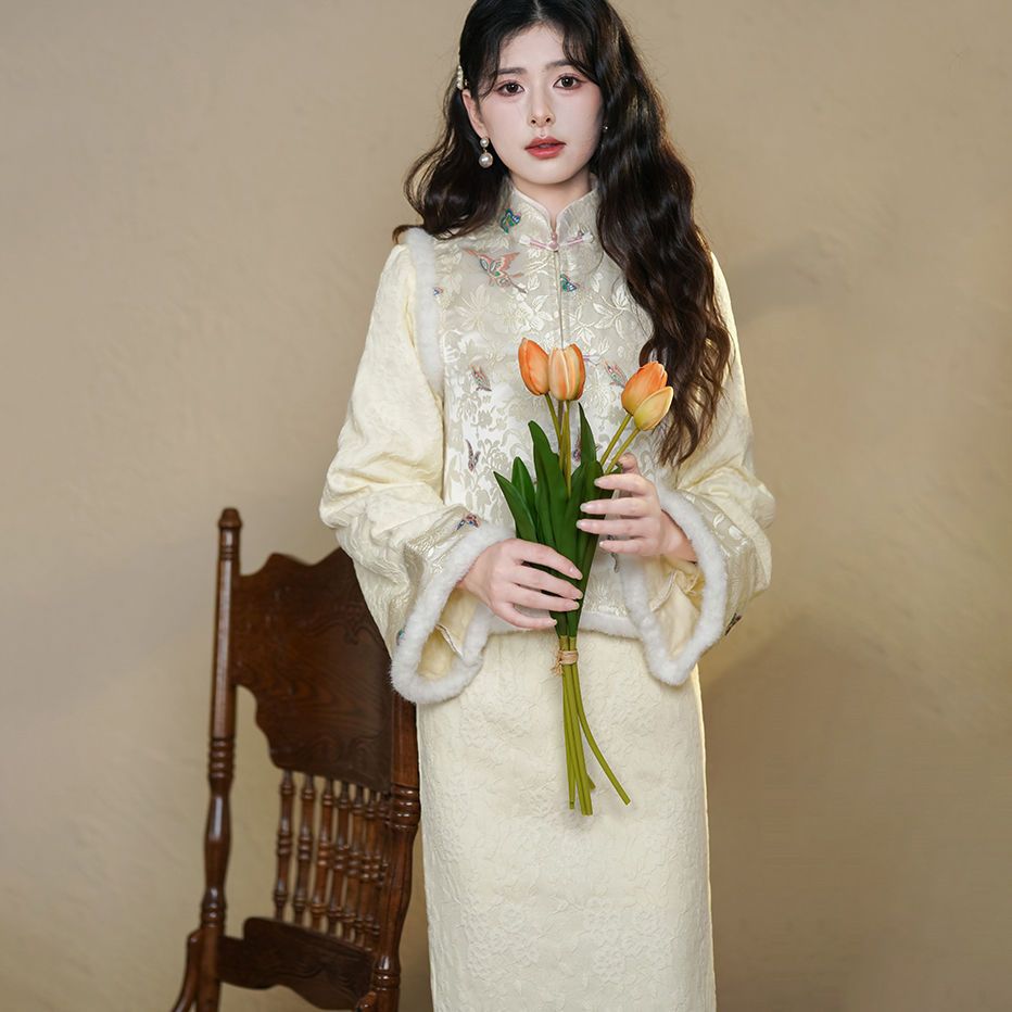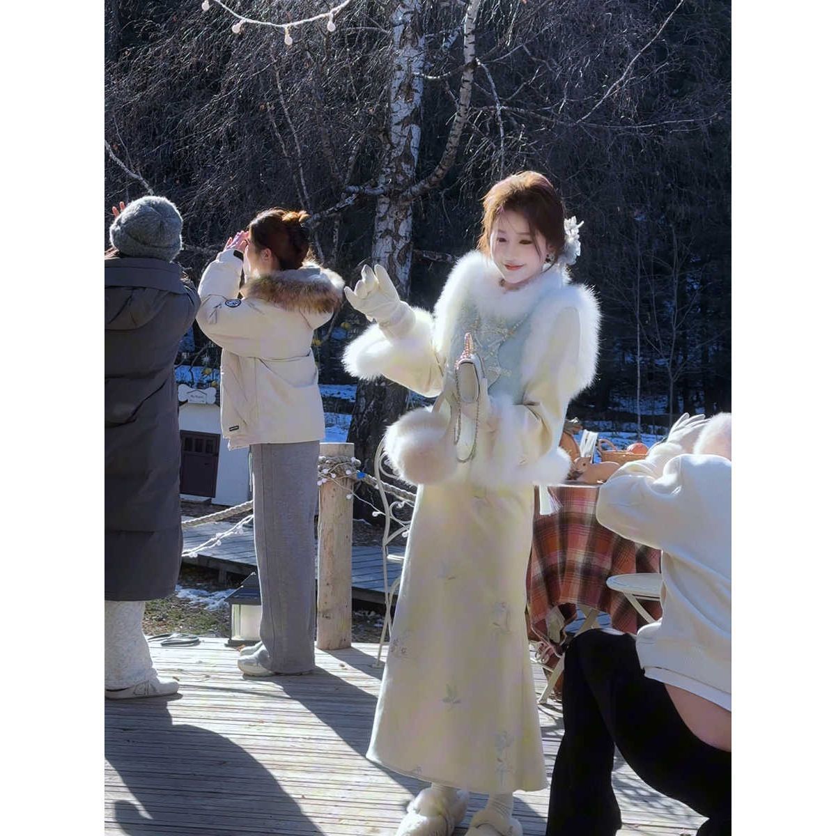新中式国风复古高级感毛领夹棉外套旗袍连衣裙两件套装裙2025冬季