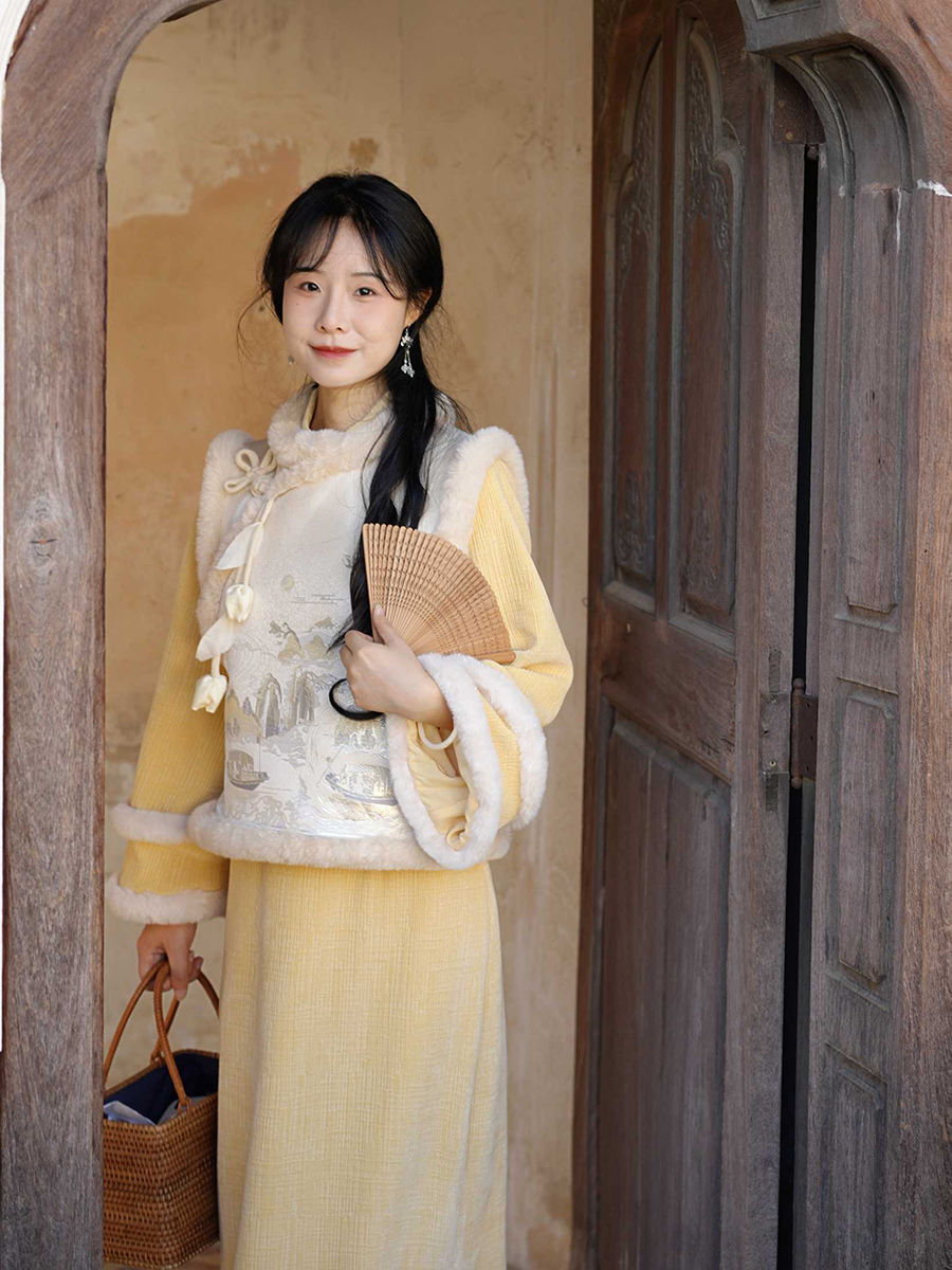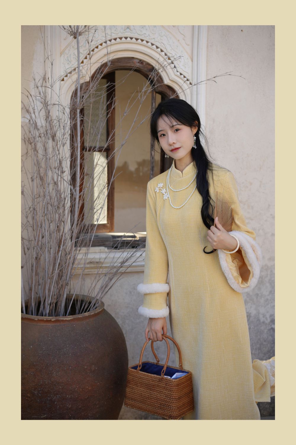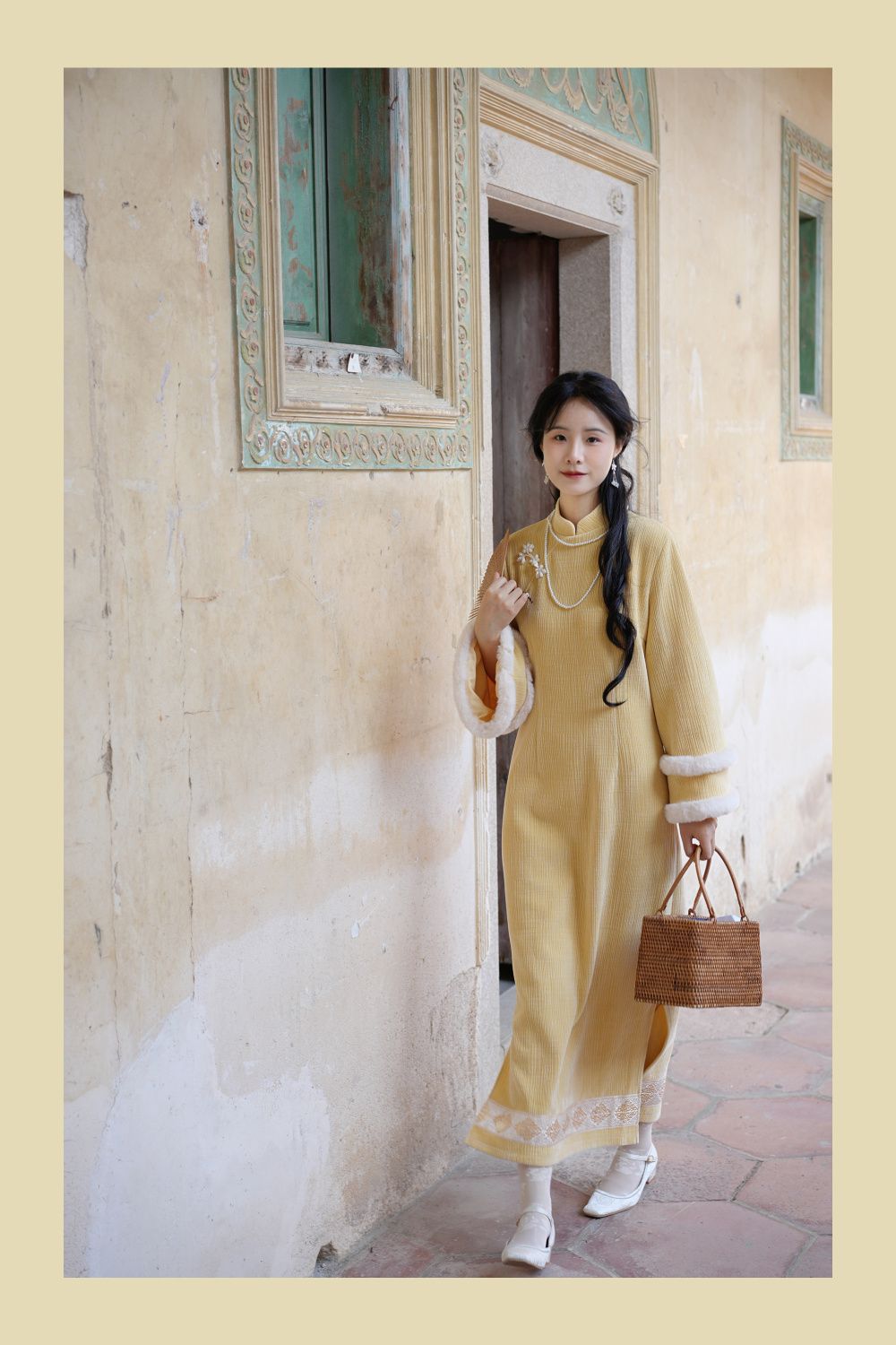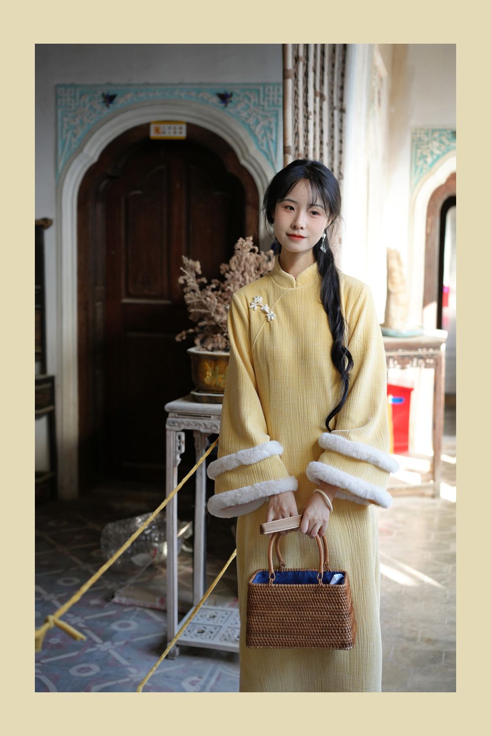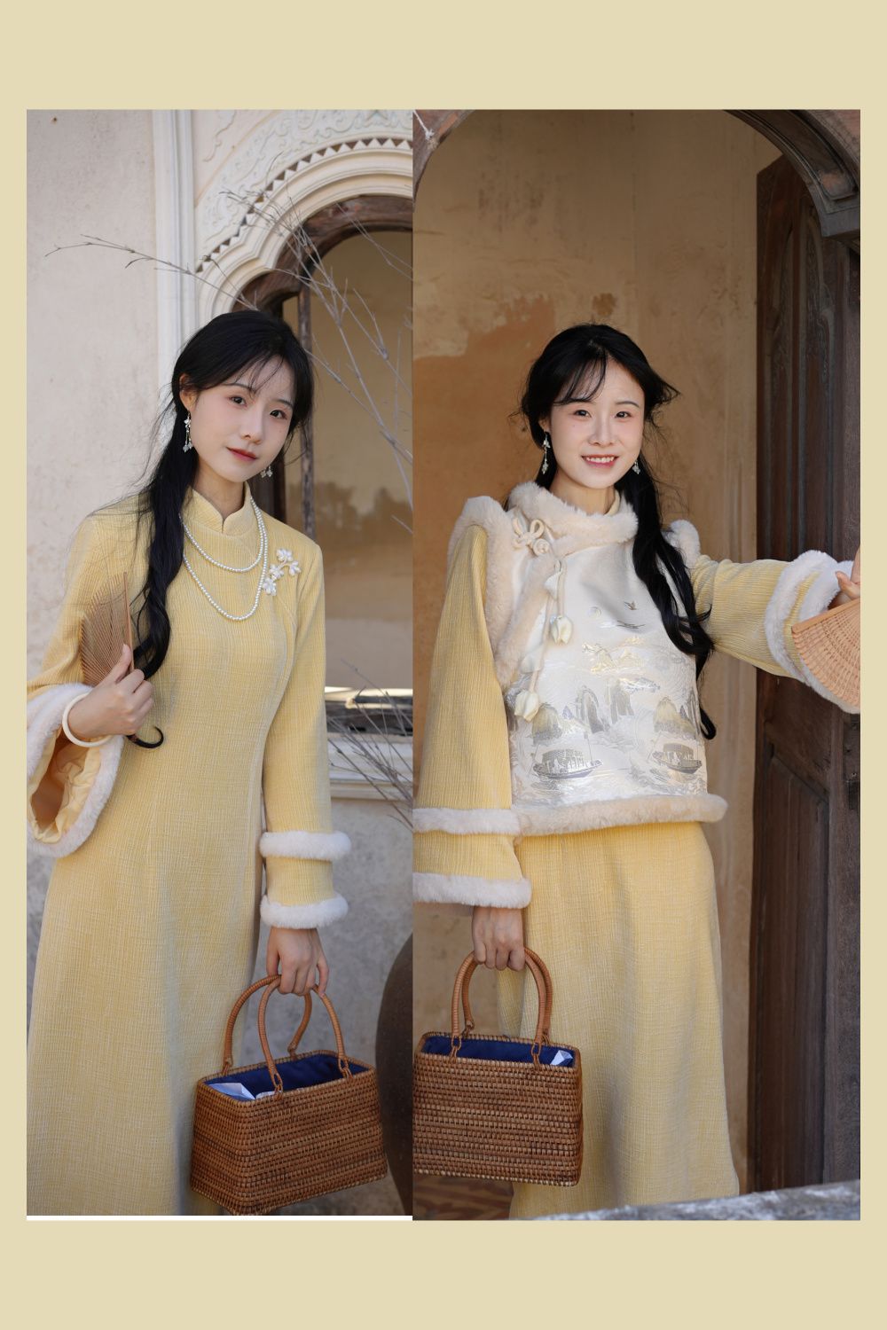 【小黄チー】超仙馬甲優し系黄色保温中長チャイナドレス2024冬の新型2点セット