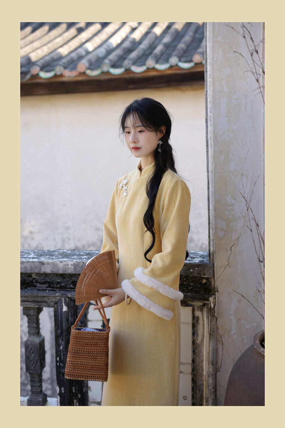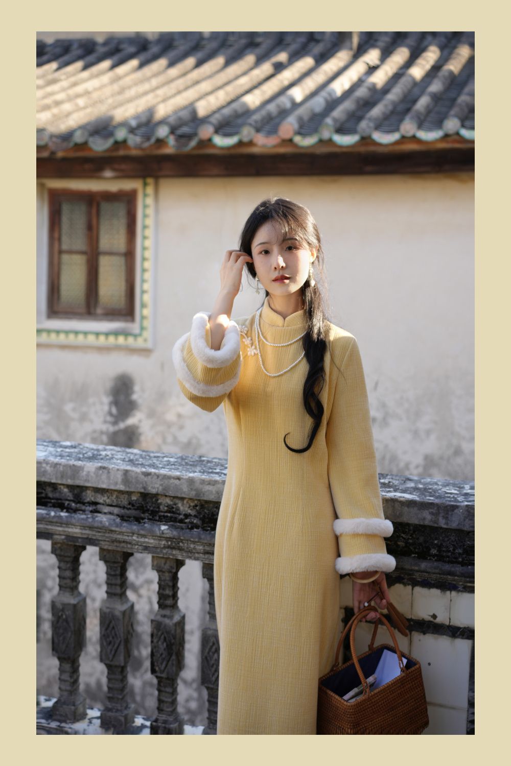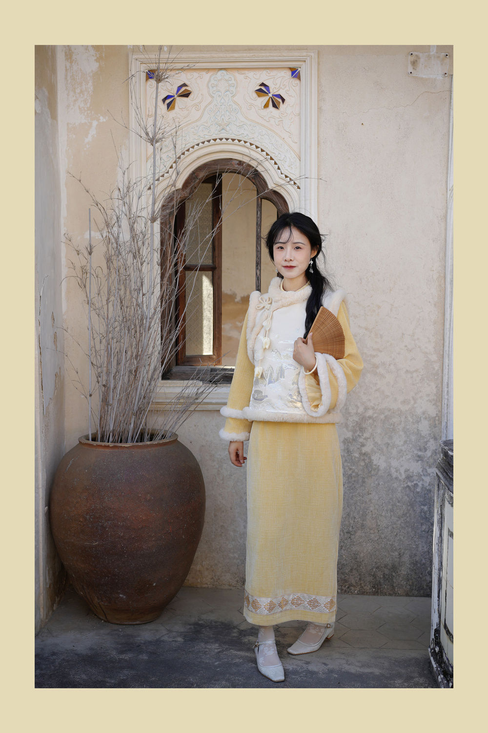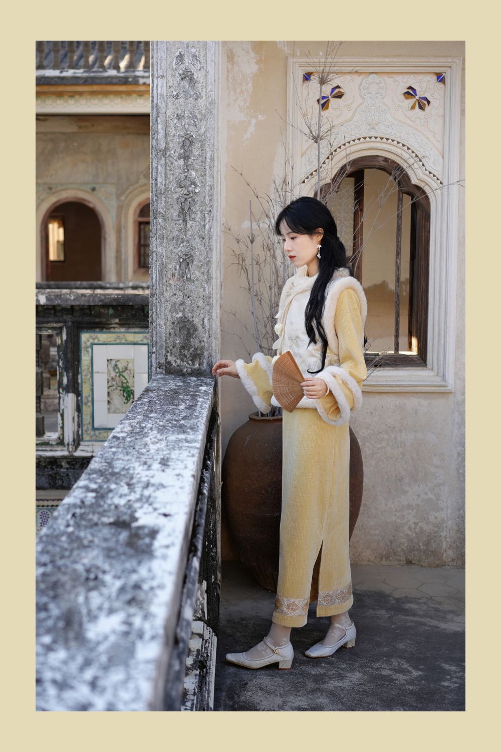 【小黄チー】超仙馬甲優し系黄色保温中長チャイナドレス2024冬の新型2点セット
