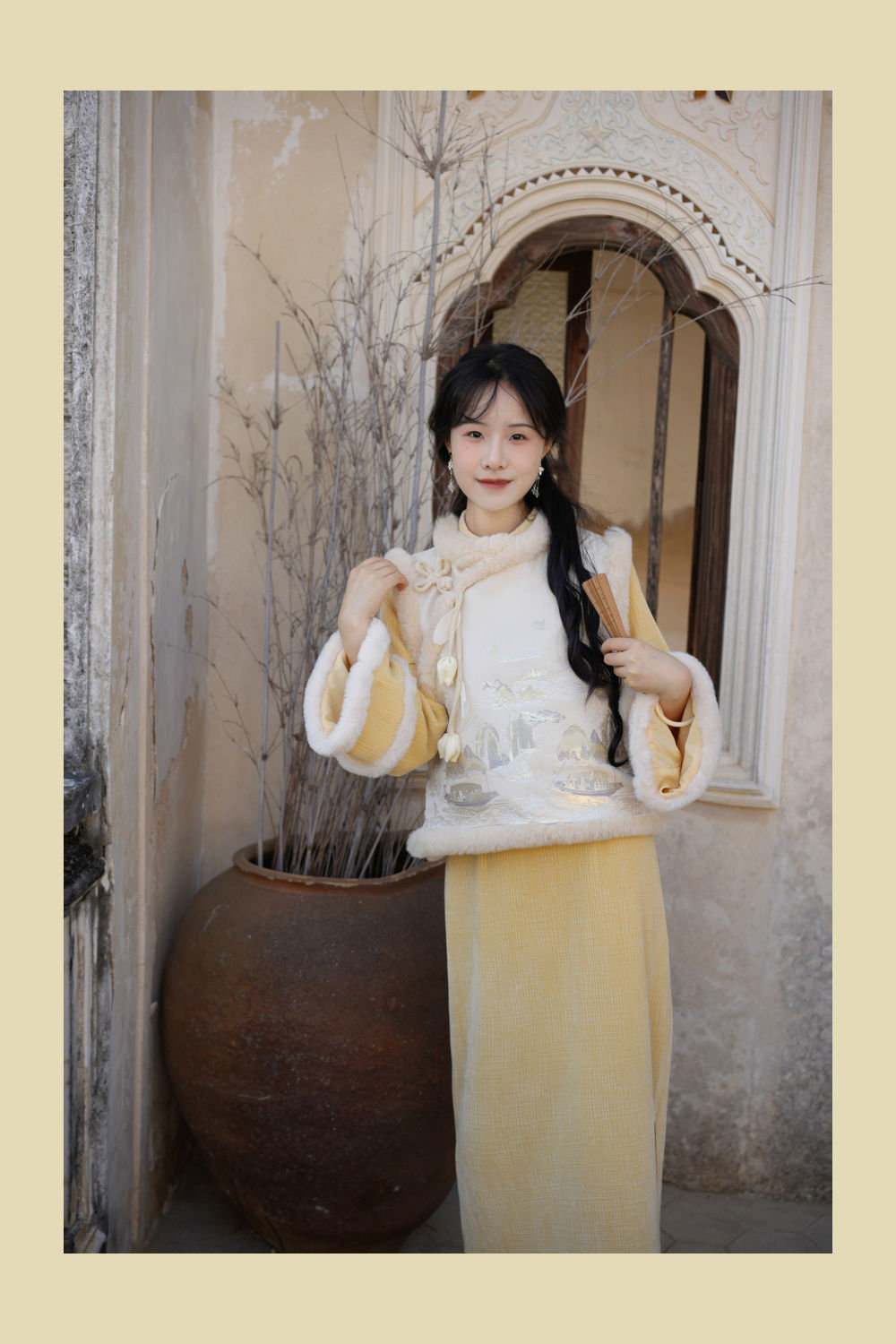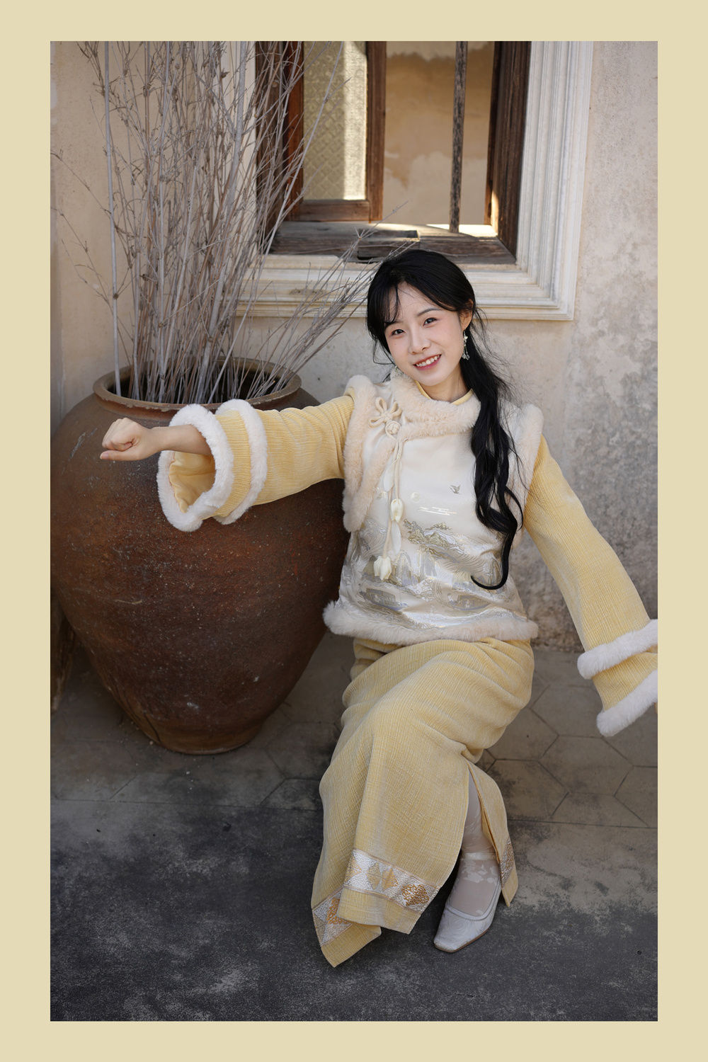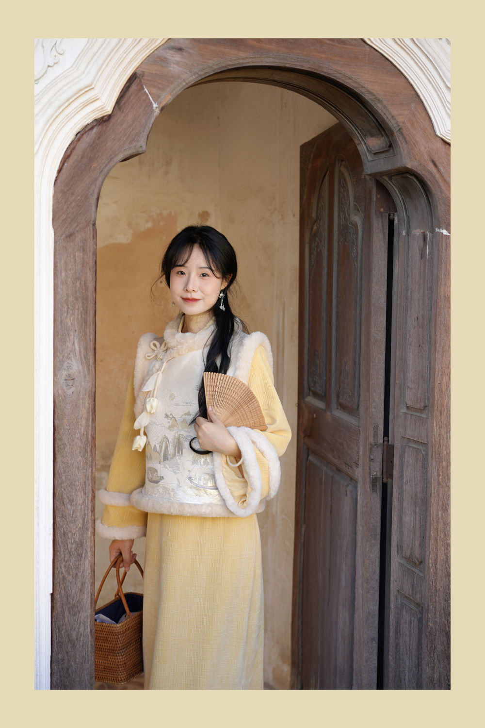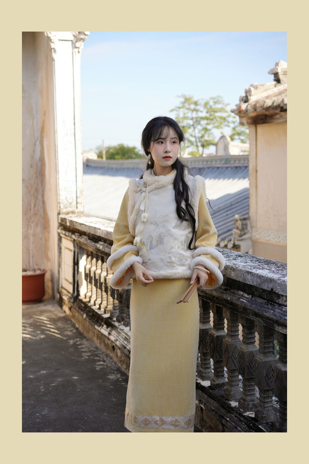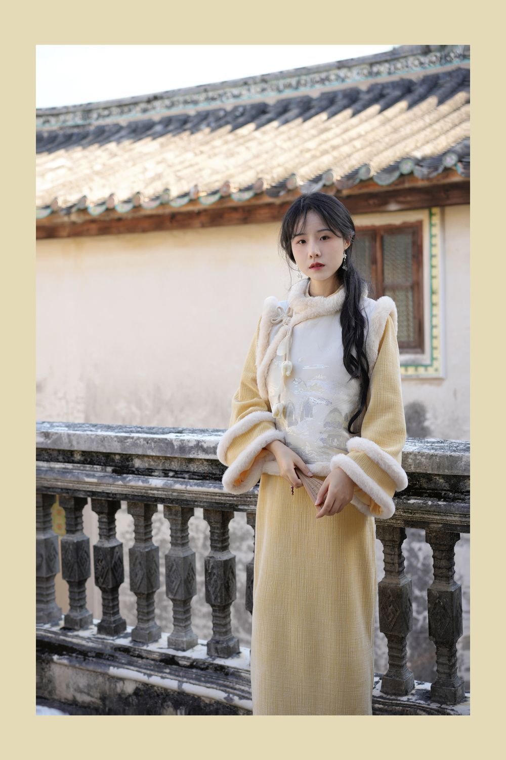 【小黄チー】超仙馬甲優し系黄色保温中長チャイナドレス2024冬の新型2点セット
