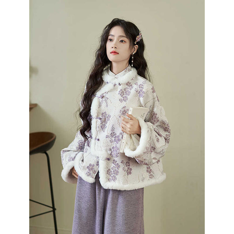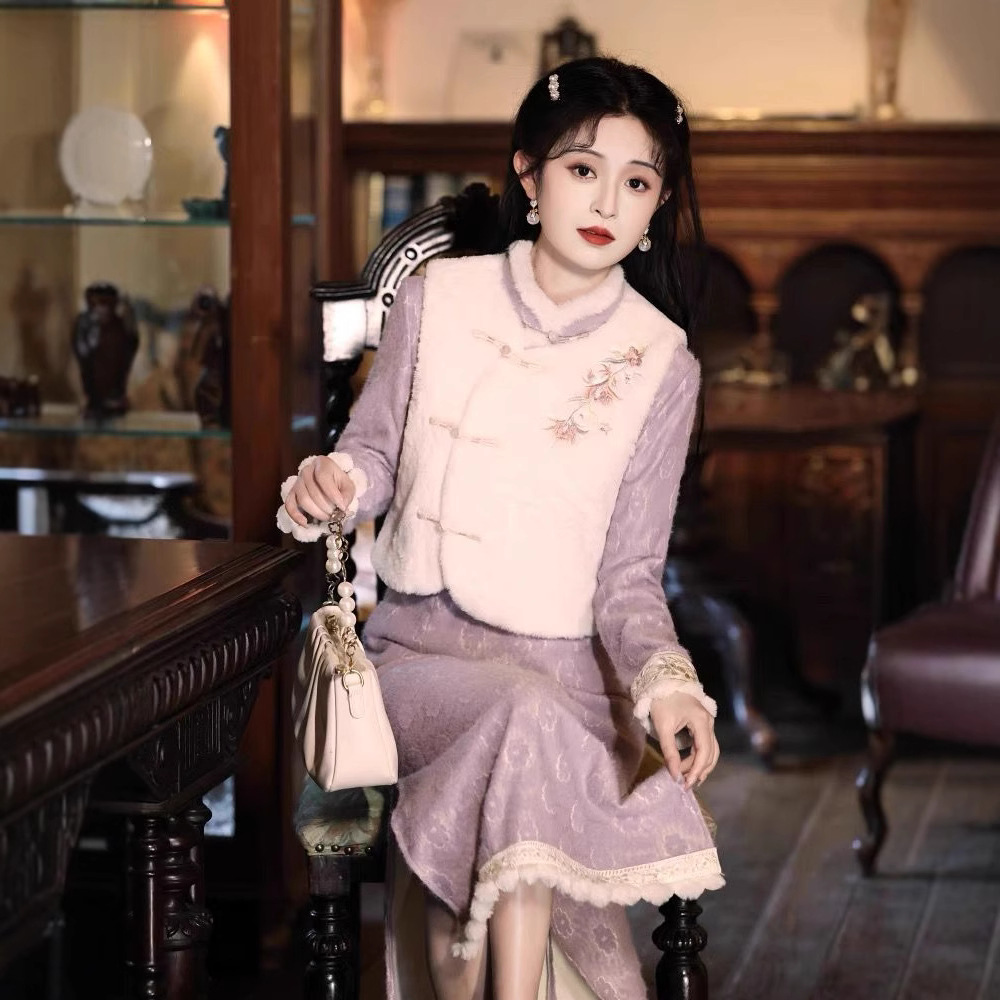紫色の旗袍、2024年秋冬新作、裏起毛・厚手、新中式如意ベストセット、多用途で若々しい改良版