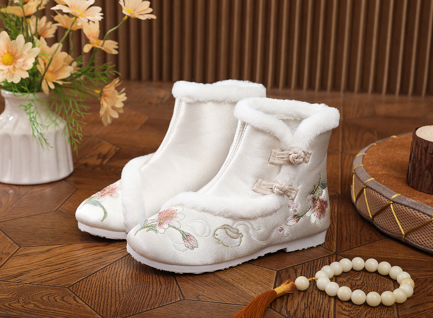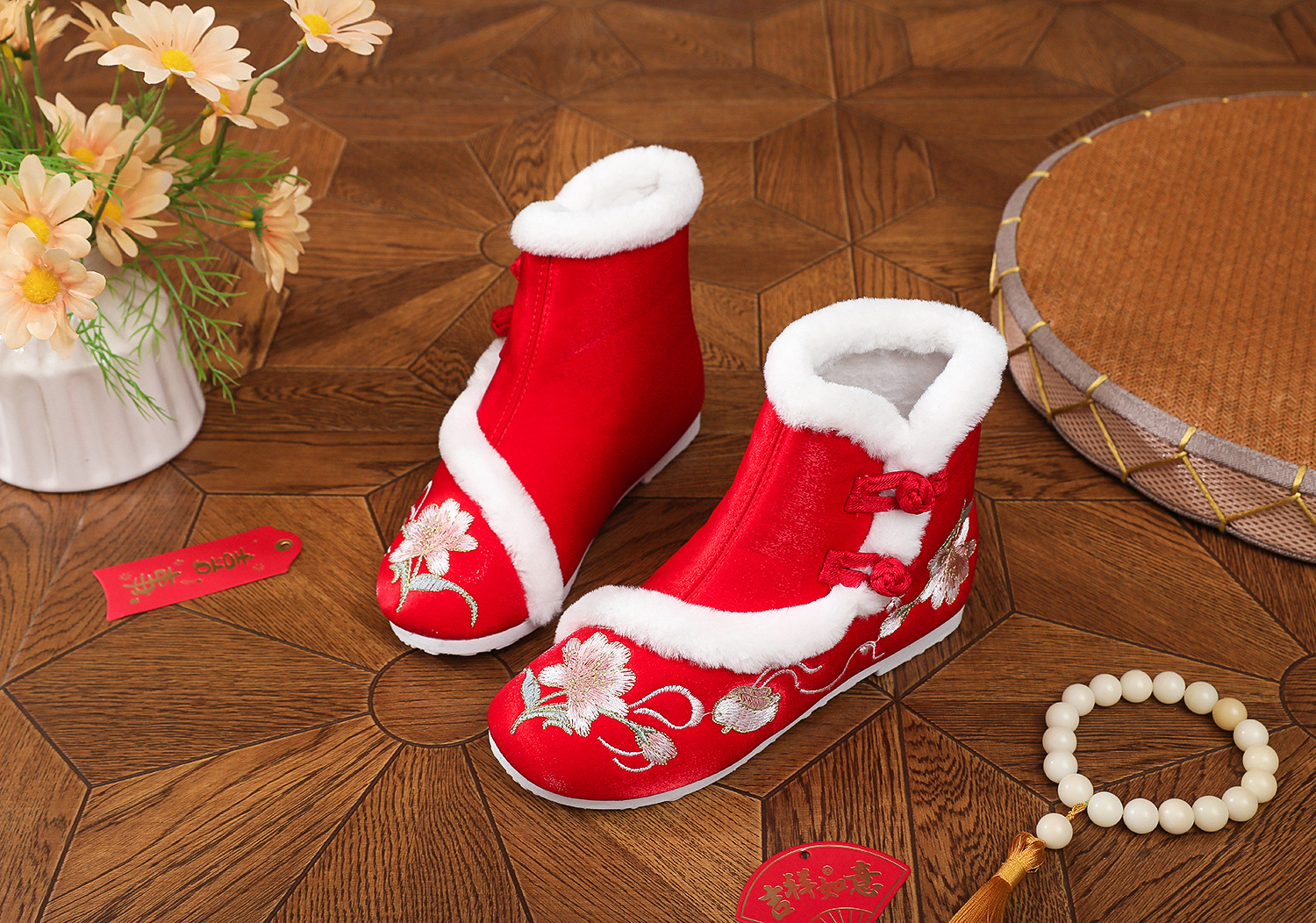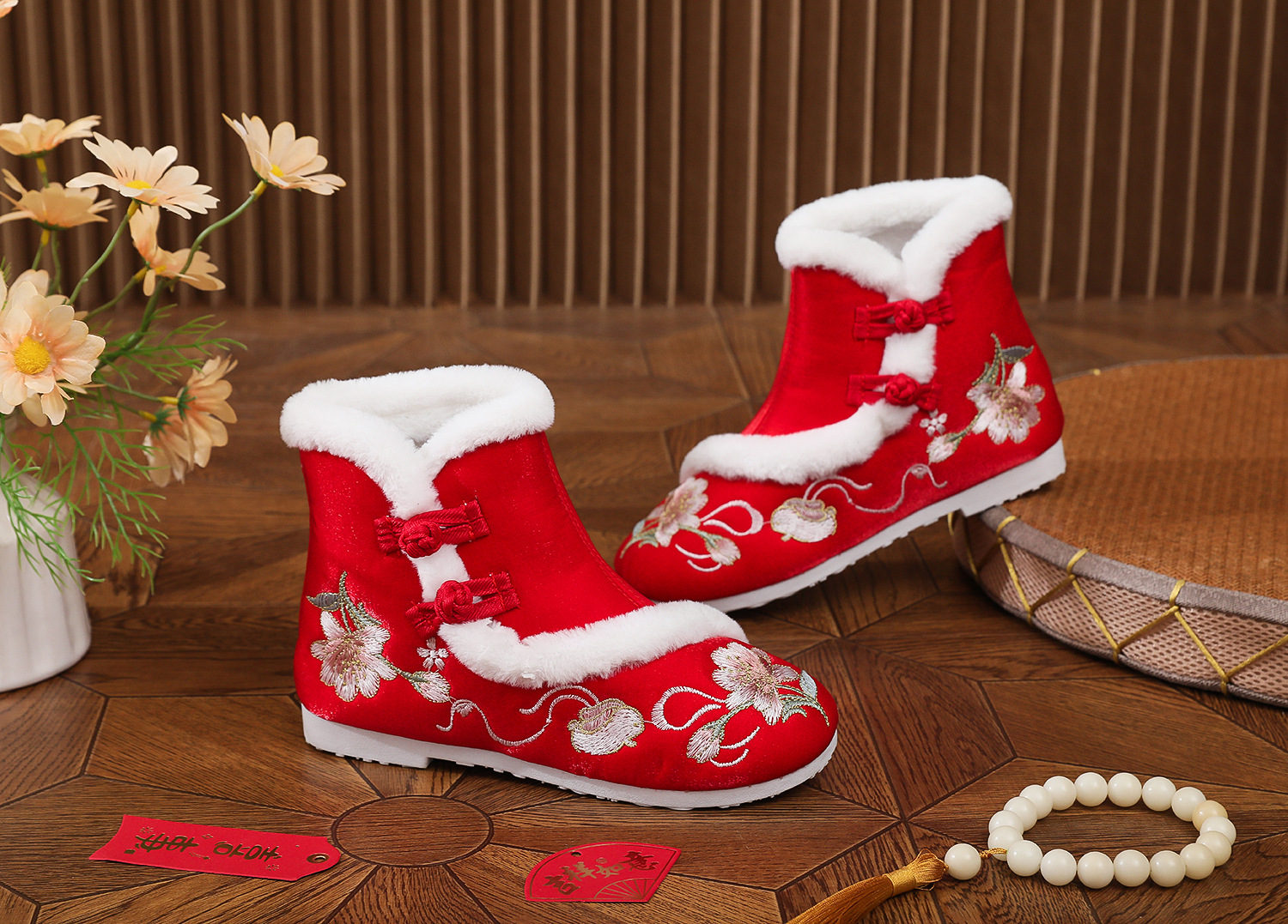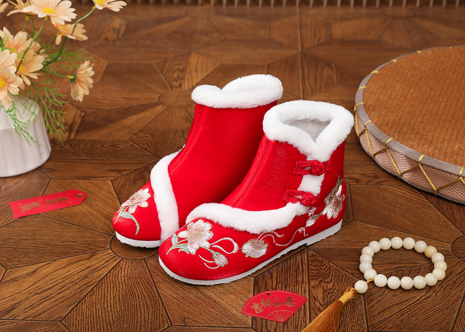 初函棉靴2025冬新款汉服鞋中国风盘扣棉靴民族风厚底加棉绣花鞋