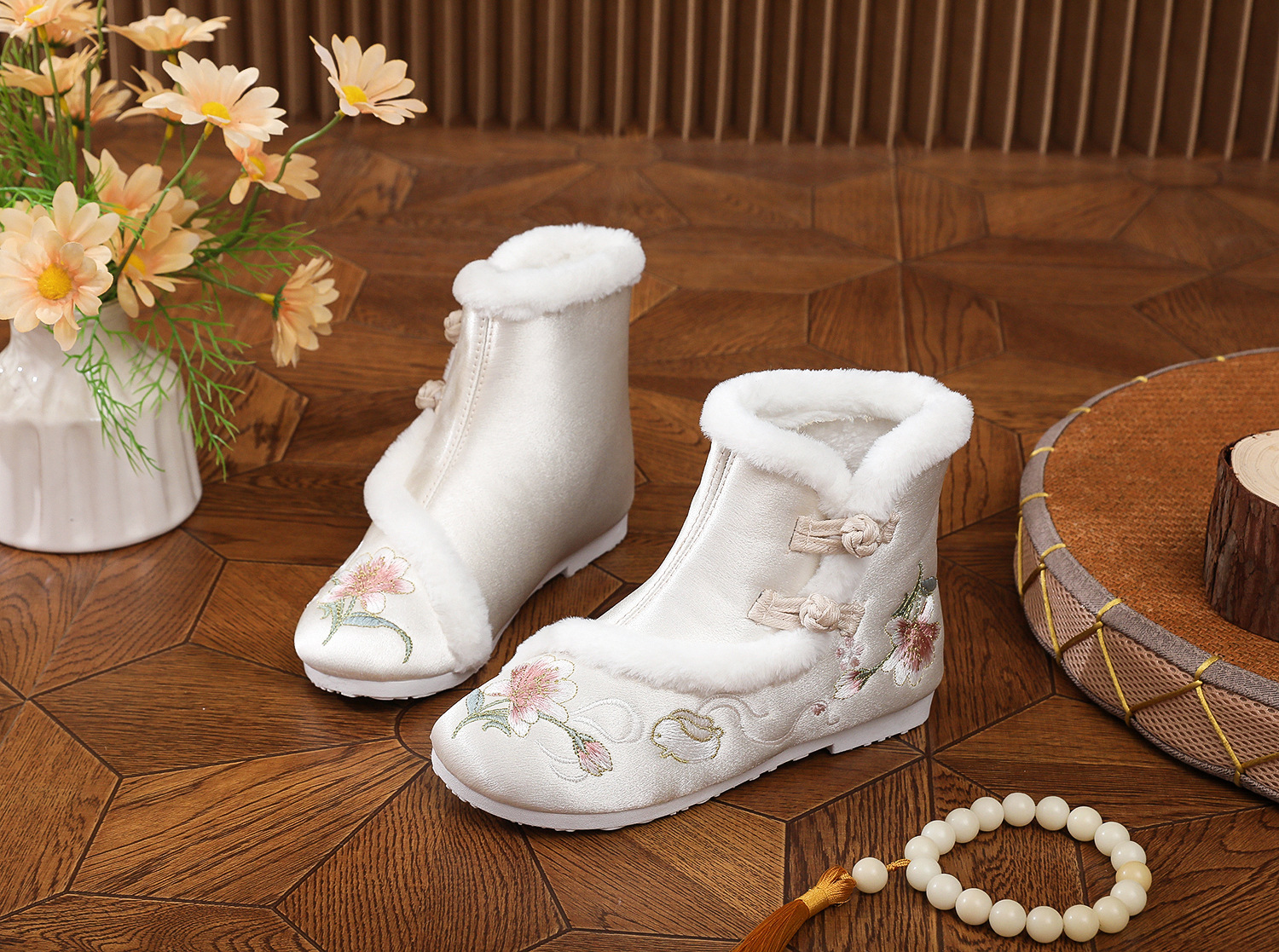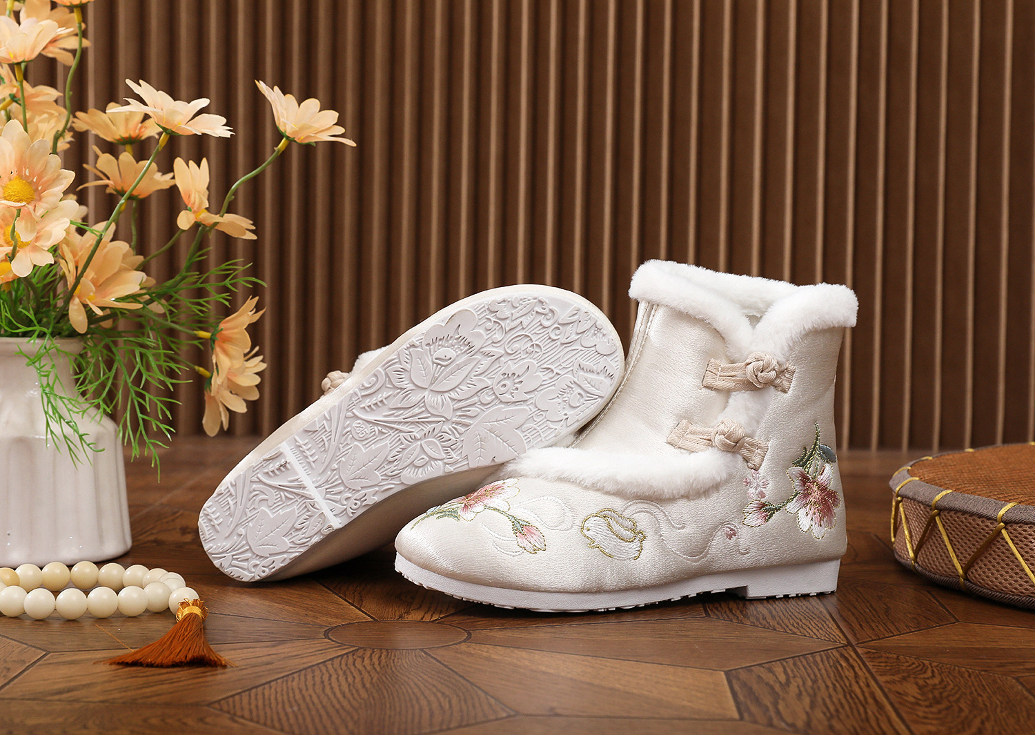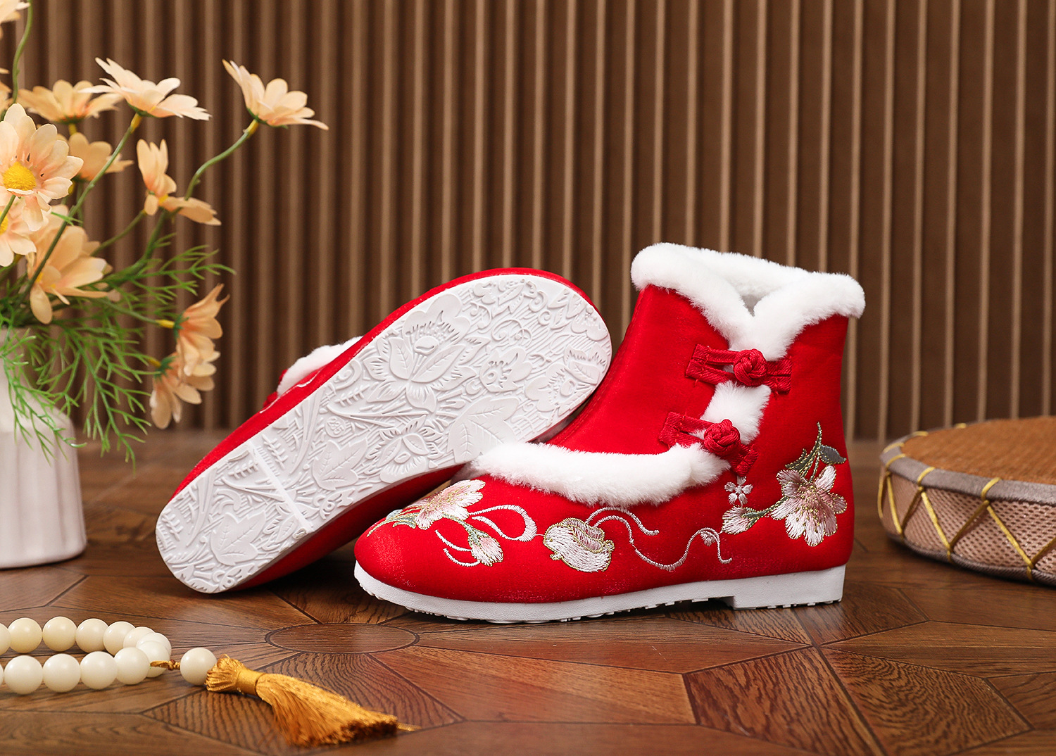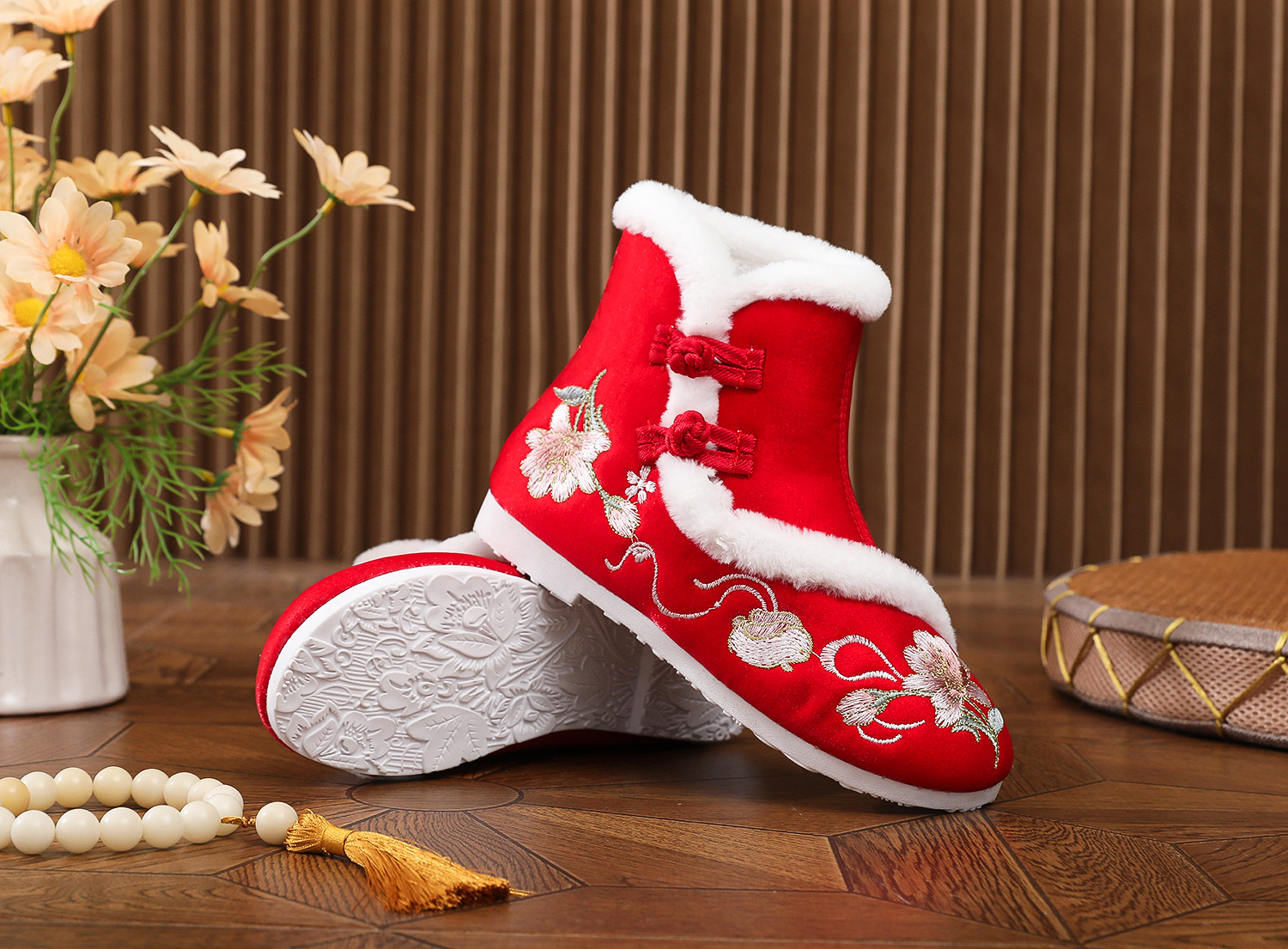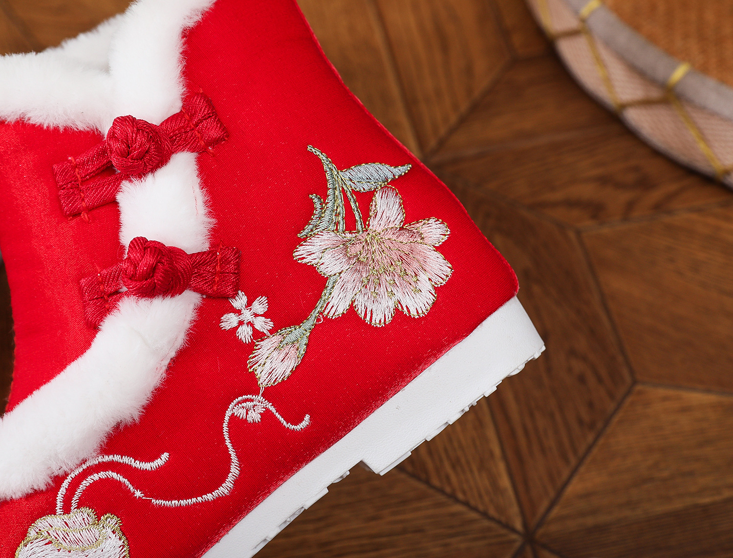 初函棉靴2025冬新款汉服鞋中国风盘扣棉靴民族风厚底加棉绣花鞋