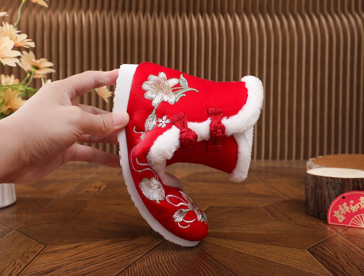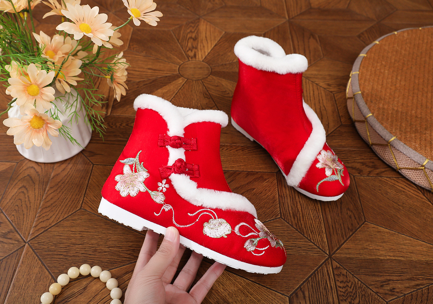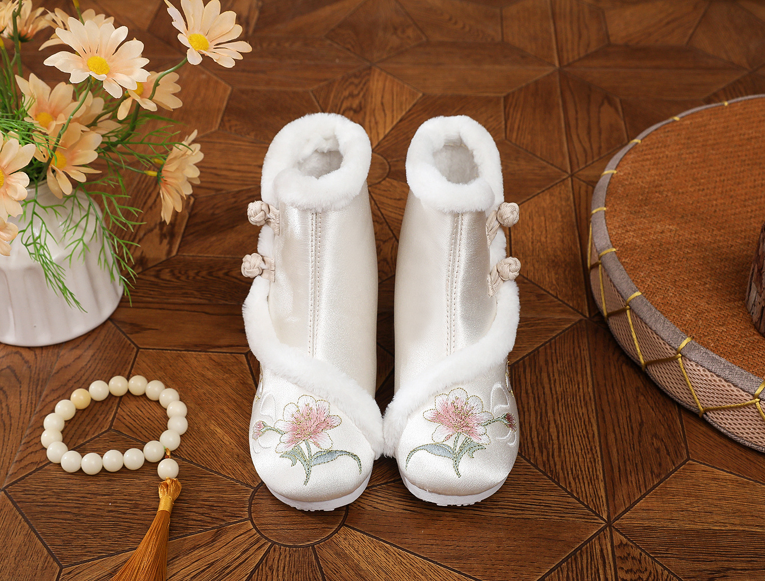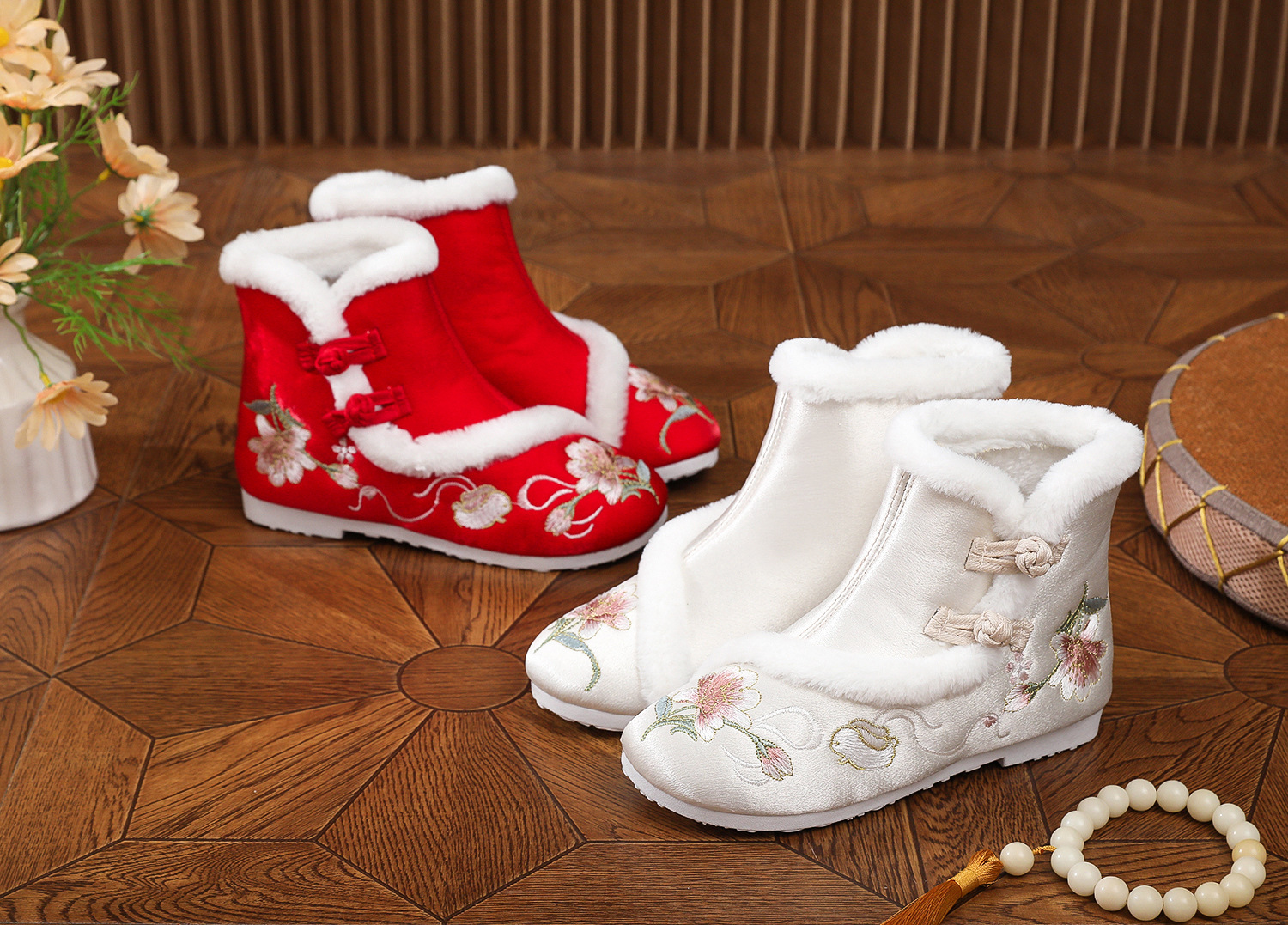 初函棉靴2025冬新款汉服鞋中国风盘扣棉靴民族风厚底加棉绣花鞋