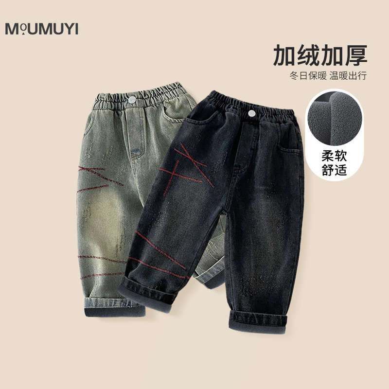 男童加绒牛仔裤2025冬季新款加厚保暖直筒裤秋冬款中小童潮牌长裤
