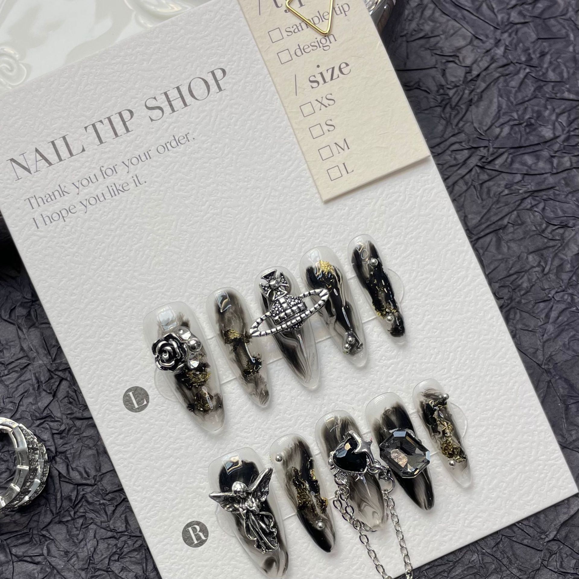 377ハンド着用甲ブラックパンク风クロハートネイルフェイクレザーネイル光ファイバーピース花嫁甲完成品