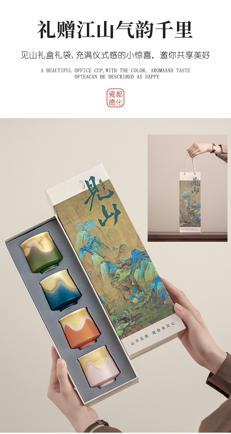创意描金渐变千里江山茶杯四杯主人杯江山山河礼盒装礼品定制logo