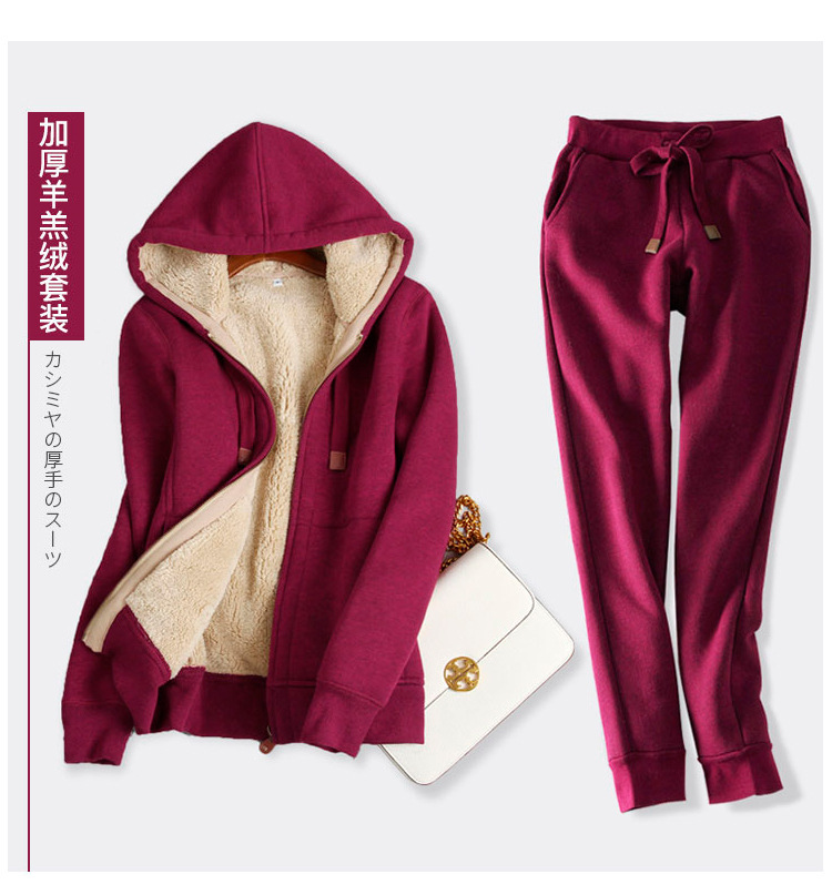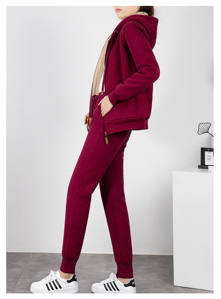 ベルベットの厚いカジュアルスーツの女性の冬のシンプルな純色のスポーツは痩せた長袖の帽子の短いコートのスポーツパンツのファッションを示しています