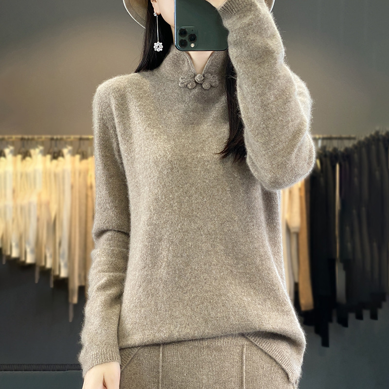 23秋冬の新型の100% ウールのセーターの女性の新しい中国式の上着のチャイナドレスの襟のセーターのゆったりしている百合のカシミヤの底のシャツ