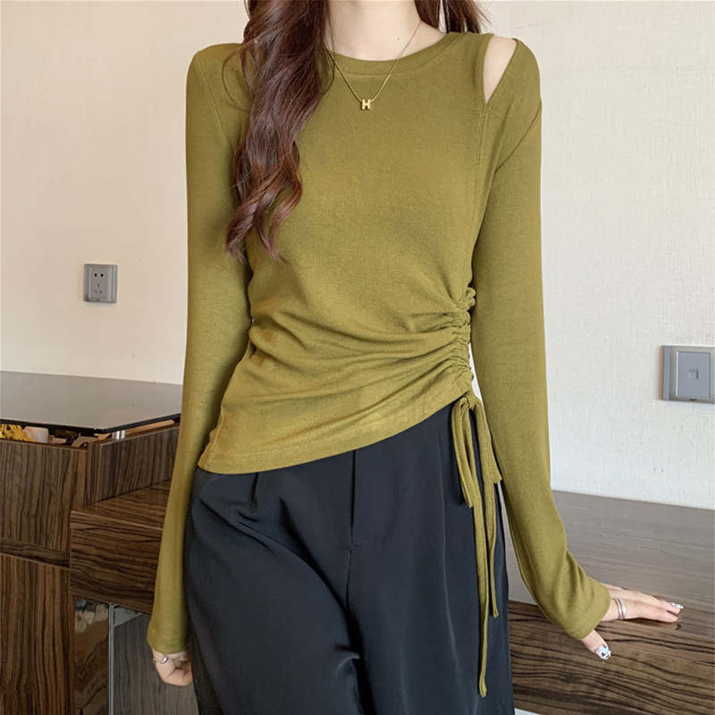 洋気の中に底の小さいシャツの女性のヨーロッパの商品の秋の新型の肩のひもの上着のデザイン感のタイトな長袖のtシャツを掛けます。