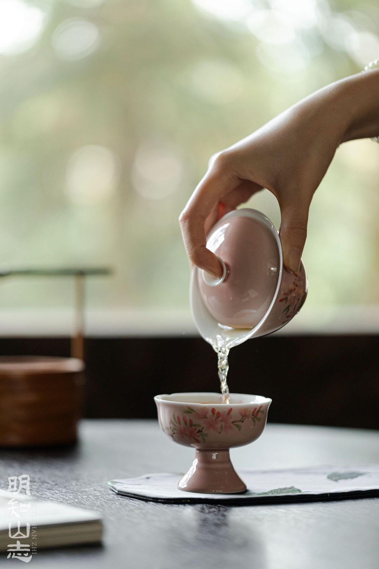 明知山志手描き桃花蓋碗工夫茶道具文人器釉薬下彩蒼煙紅泡茶碗家庭用蓋碗