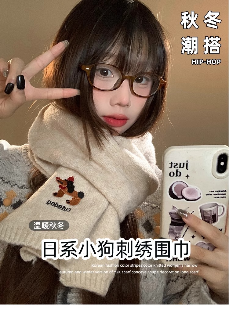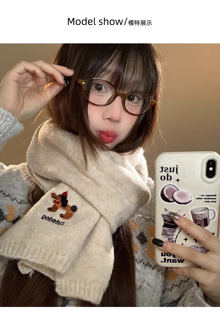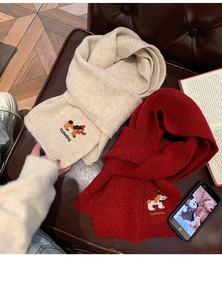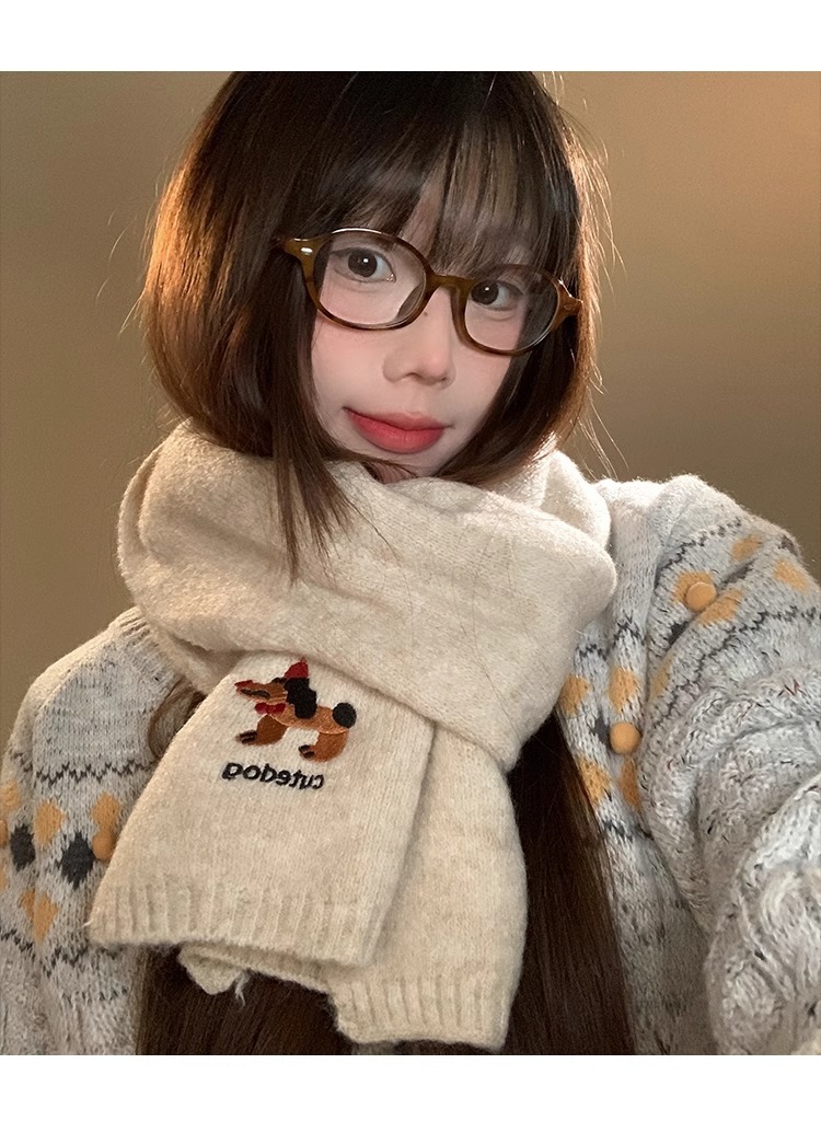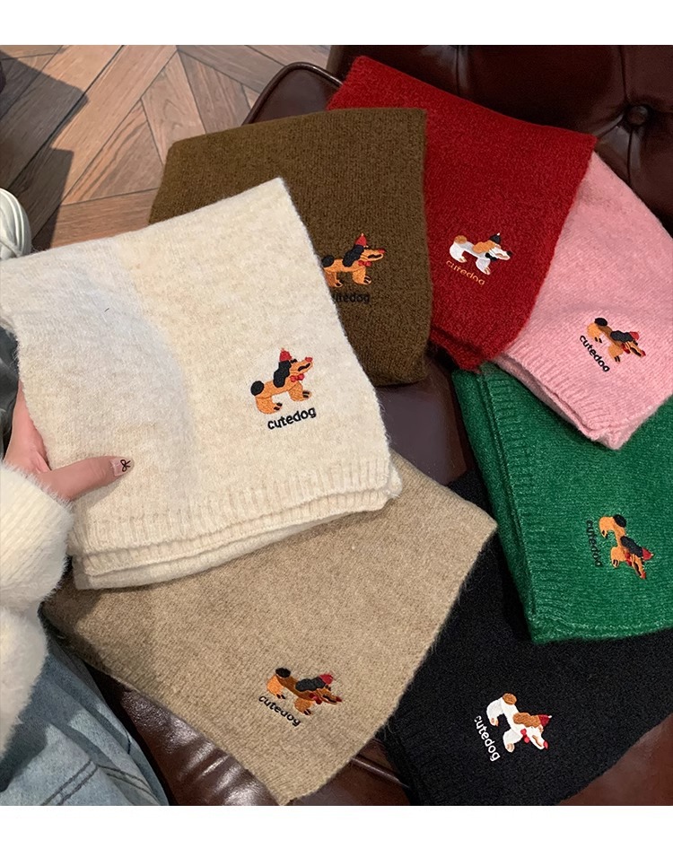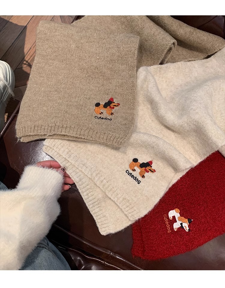 日系のかわいい子犬の刺繍のマフラーの女性の秋の冬の2024の新型の保温の百合学院の風のメリヤスのマフラーの潮
