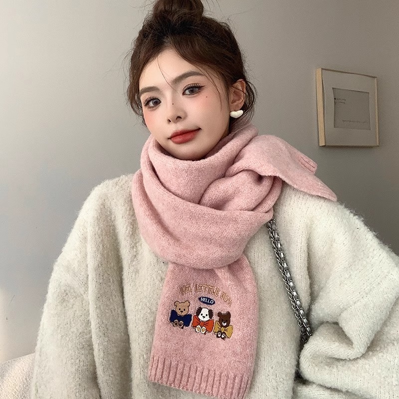 ドーパミンかわいい熊刺繍ニットマフラー女性冬高級感保温防寒百合学生毛糸マフラー